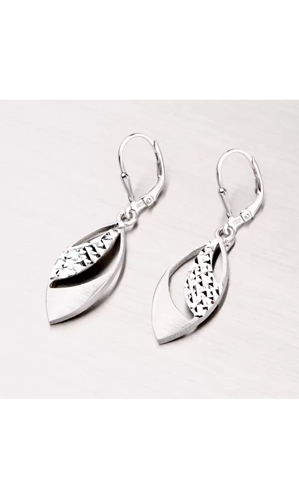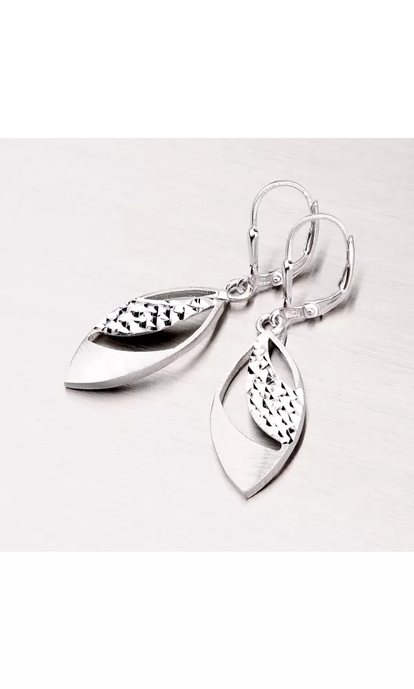 Prepracované dámske náušnice sú v tvare kvapiek s prierezmi zdobené zamatovým matom a diamantovým gravírovaním, kde diamantový hrot rýbacieho nástroja zaisťuje neuveriteľne vysoký lesk. Náušnice sú vyrobené zo striebra rýdzosti 925/1000 a povrch náušnice je zušľachtený rhodiovaním. Tieto náušnice sa zapínajú na klapku.