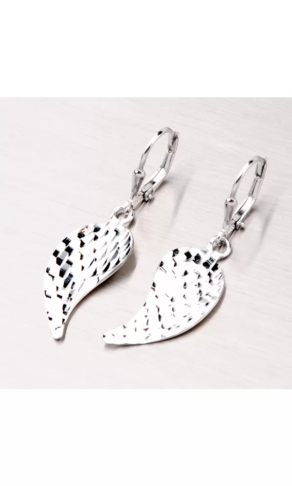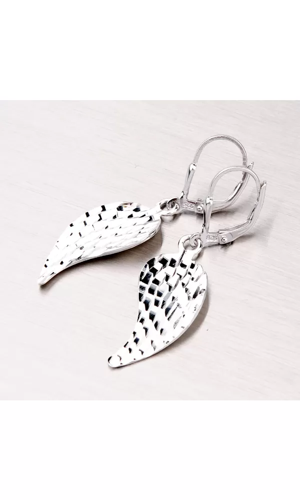 Krásne dámske náušnice sú vyrobené zo striebra rýdzosti 925/1000 a povrch náušnice je zušľachtený rhodiovaním. Náušnice sú v tvare anjelských krídiel. Imitácia peria je tvorená diamantovým gravírovaním, kde diamantový hrot rýbacieho nástroja zaisťuje neuveriteľne vysoký lesk. Náušnice sa zapínajú na klapku.