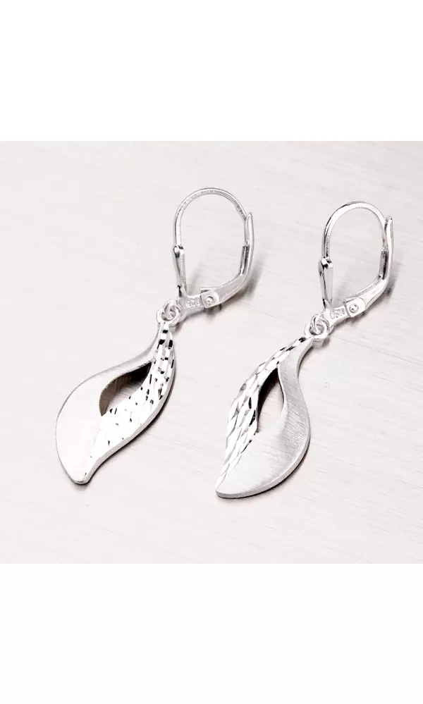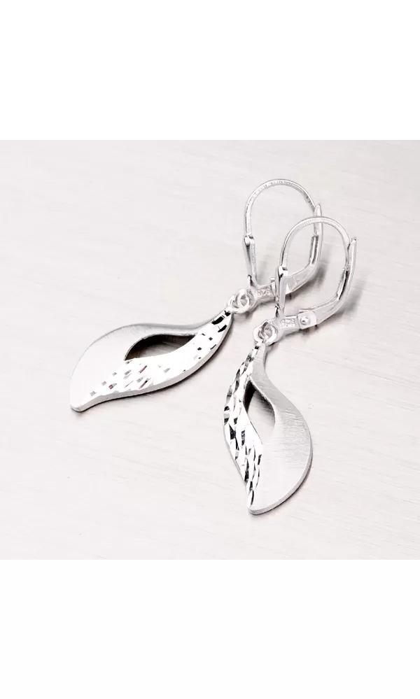 Prepracované dámske náušnice sú v tvare lístkov s prierezmi zdobené zamatovým matom a diamantovým gravírovaním, kde diamantový hrot rýbacieho nástroja zaisťuje neuveriteľne vysoký lesk. Náušnice sú vyrobené zo striebra rýdzosti 925/1000 a povrch náušnice je zušľachtený rhodiovaním. Tieto náušnice sa zapínajú na klapku.