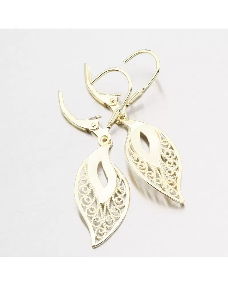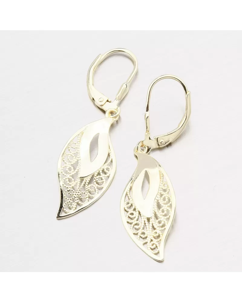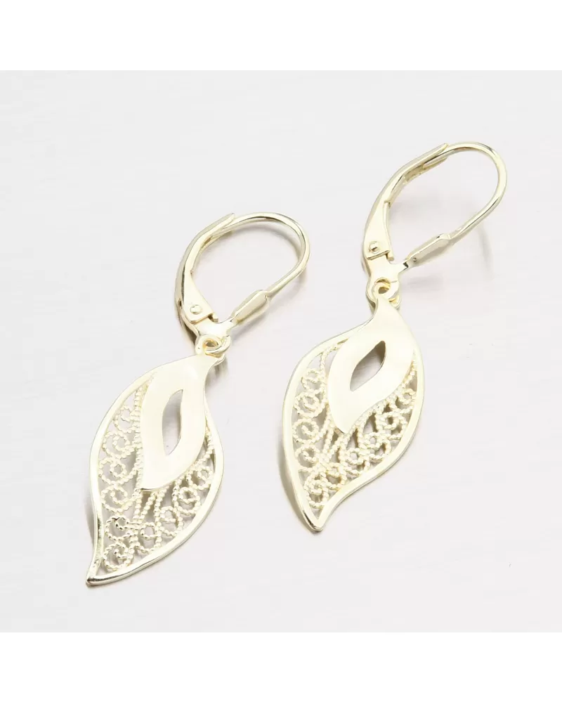 Krásne strieborné náušnice, ktoré vyniká vo vzorke filigrue na dekoráciách pádiel v tvare listu. Tieto náušnice sa vyrábajú pomocou presných techník filigree. Je to starodávna technika zdobenia šperkov, ktorá pozostáva z krútenia a spájkovania jemných drôtov drahých kovov.