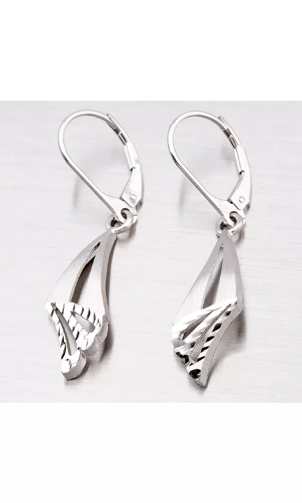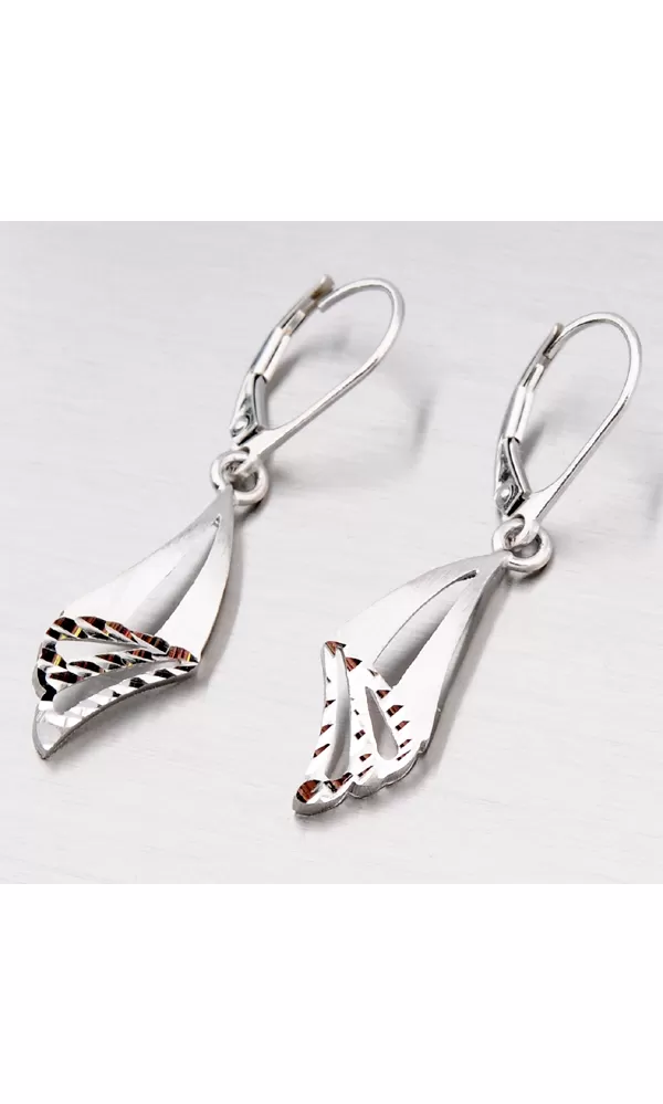 Prepracované dámske náušnice so zaujímavým tvarom prívesku a prierezy zdobené zamatovým matom a diamantovým gravírovaním, kde diamantový hrot rýľovacieho nástroja zaisťuje neuveriteľne vysoký lesk. Tieto náušnice sa zapínajú na klapku.