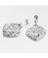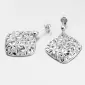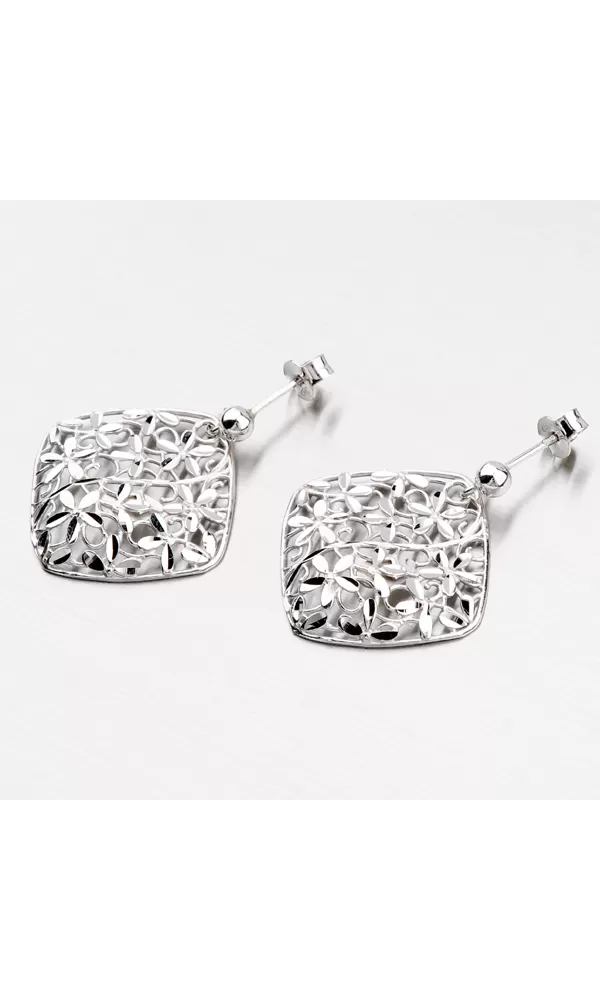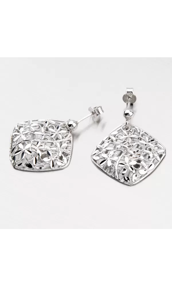 Neprehliadnuteľné visiace náušnice pozdvihnú Váš vzhľad na inú úroveň. Nebojte sa väčších šperkov. Konkrétne tieto náušnice sú tvorené z ozdoby v tvare štvorca. V ozdobe sú do seba nepravidelne prepletené kvety. Kvety sú zdobené diamantovým gravírovaním, kde diamantový hrot rýbacieho nástroja zaisťuje neuveriteľne vysoký lesk. Celú túto nádheru je potrebné bezpečne zapnúť ao to sa postarajú puzetky.