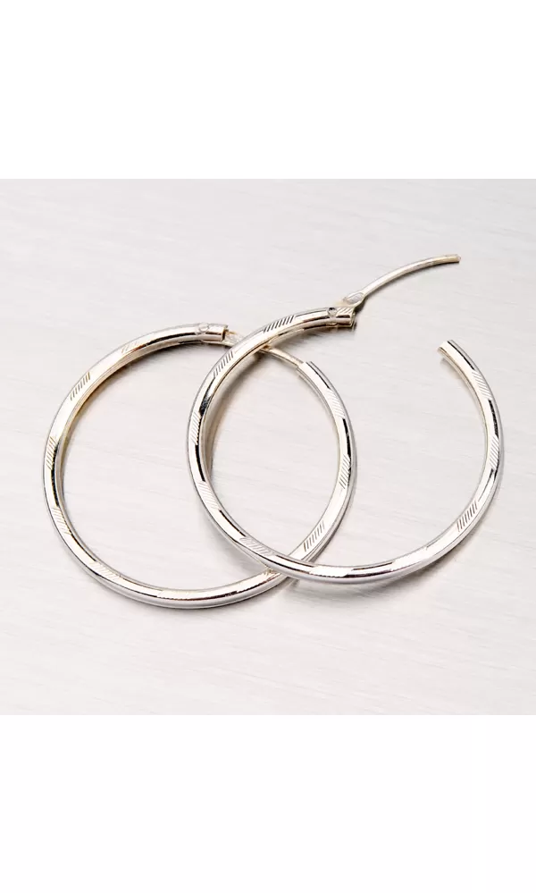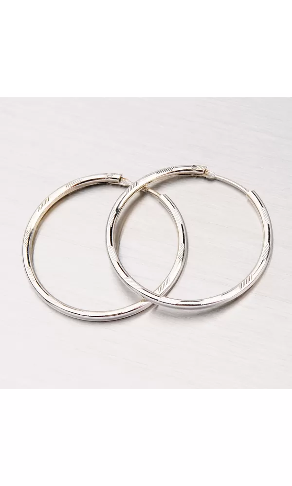 Obľúbené náušnice – kruhy z rhodiovaného striebra s rýdzosťou 925/1000 v lesklej povrchovej úprave. Kruhy patria k najobľúbenejším druhom náušníc. Hodí sa pre každú ženu či dievča a budú ideálnym darčekom, ktorý zaručene urobí radosť. Náušnice sú zdobené gravírovaním. Gravírovanie je prevedené diamantovým rycím hrotom, ktorý zaisťuje najvyšší možný lesk gravírovaných facet.