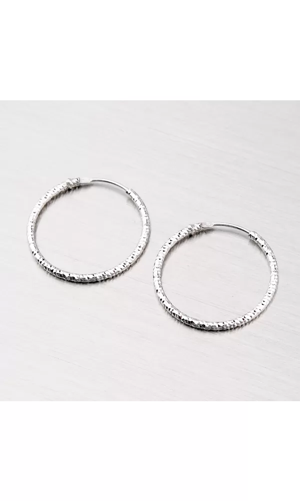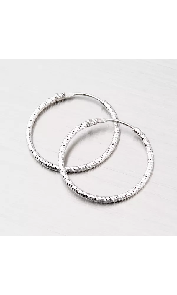 Moderné náušnice – kruhy zo striebra s rýdzosťou 925/1000 v lesklej povrchovej úprave. Náušnice sú rhodiované a sú zdobené gravírovaním.