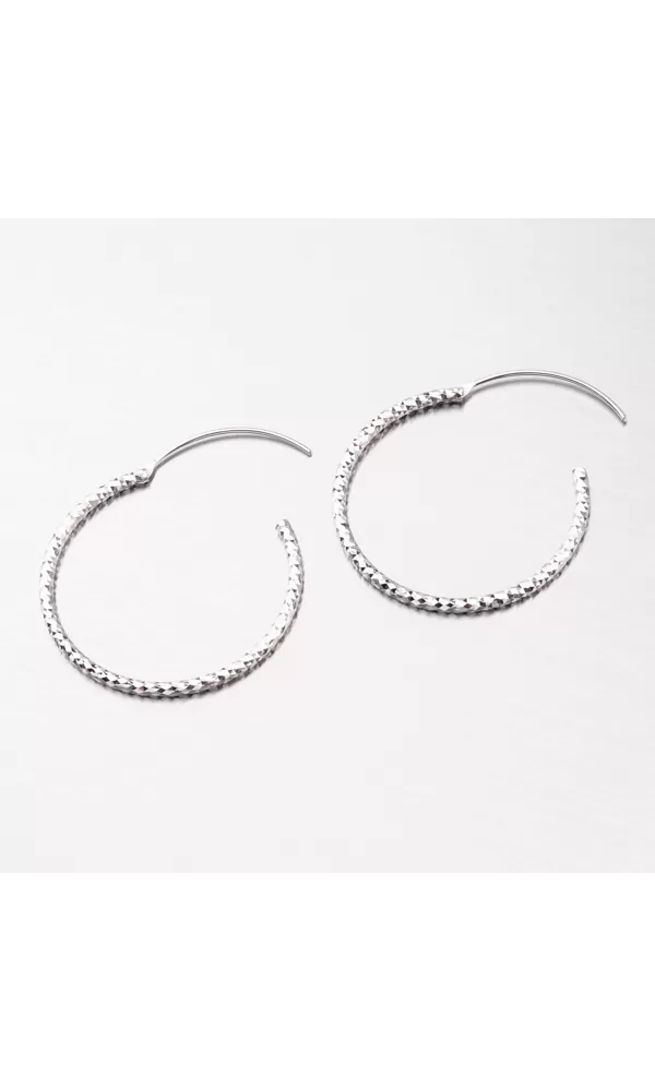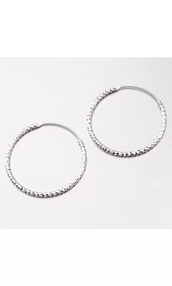 Strieborné náušnice kruhy by mala mať každá žena vo svojej šperkovnici. je to jeden z najobľúbenejších druhov náušníc. Tieto náušnice kruhy sú zaujímavým prekrásnym gravírovaním. Gravírovanie je prevedené diamantovým rycím hrotom, ktorý zaisťuje najvyšší možný lesk gravírovaných facet.