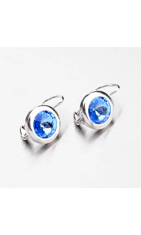 Visiace dámske náušnice sú vyrobené zo striebra rýdzosti 925/1000 s jedným modrým swarovki kryštálom, ktorý je zasadený do strieborného lemovania v lesklej povrchovej úprave.
