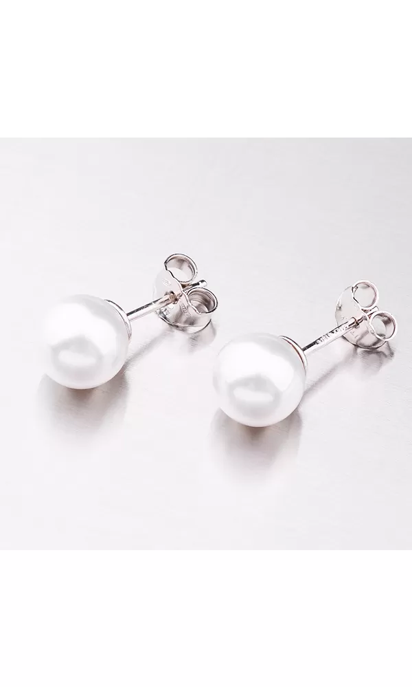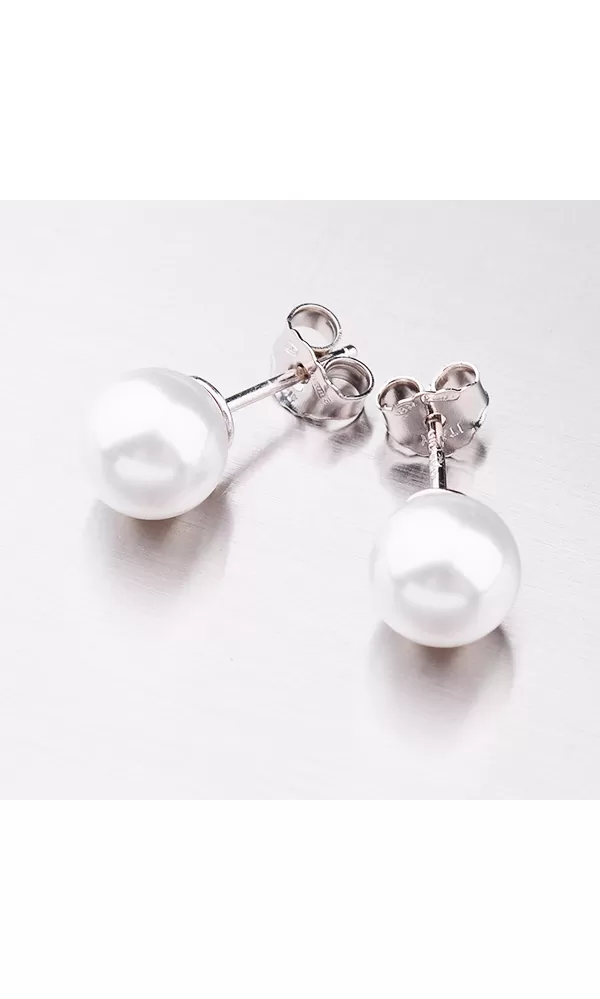 Elegantné a jemné náušnice zdobené syntetickou perlom v bielej farbe. Náušnice sú pripevnené k hádanke.