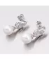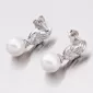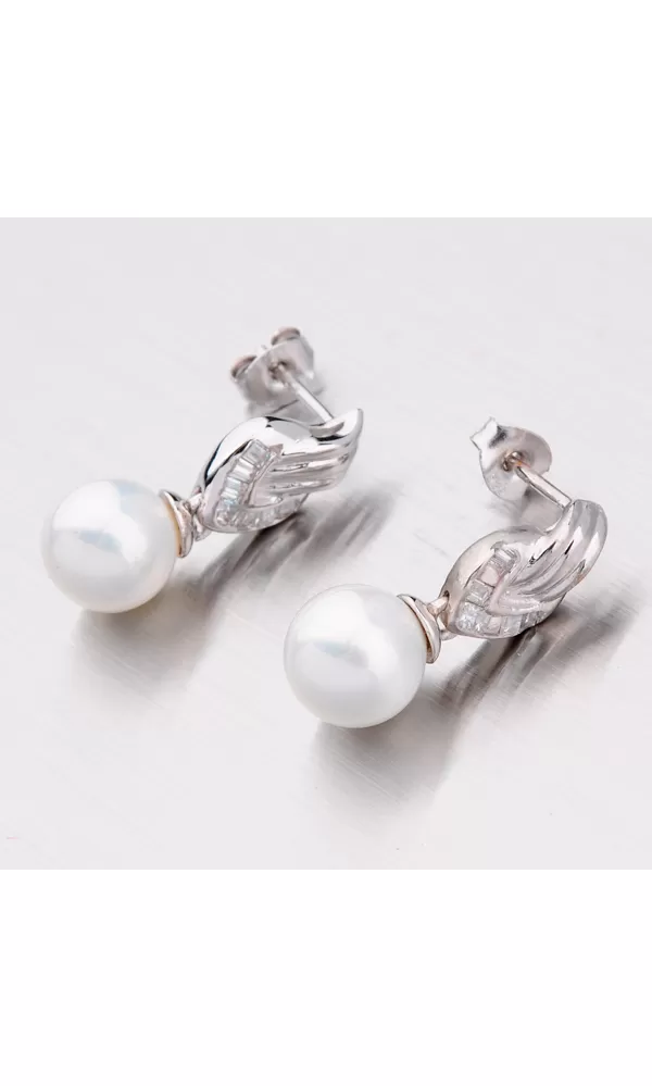 Jemné náušnice s umelou perlou perleťovo bielej farby a drobnými zirkónmi sú vyrobené z rhodiovaného striebra rýdzosti 925/1000 v lesklom prevedení so zapínaním na puzety.