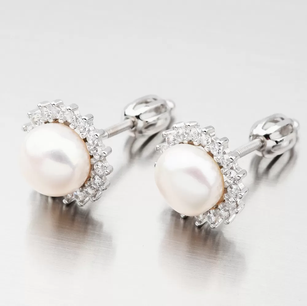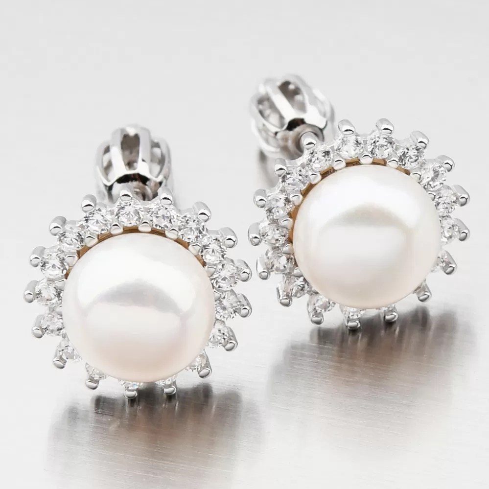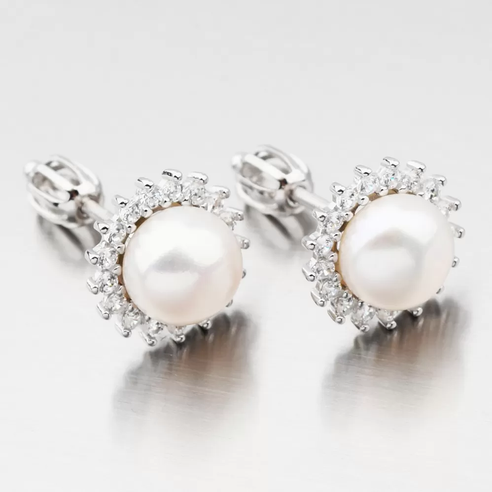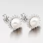 Neprehliadnuteľné kôstky sú zdobené veľkou syntetickou perlou v bielej farbe, ktorú obklopujú zirkónmi v briliantovom bruse. Náušnice sa zapínajú na skrutku.
