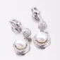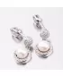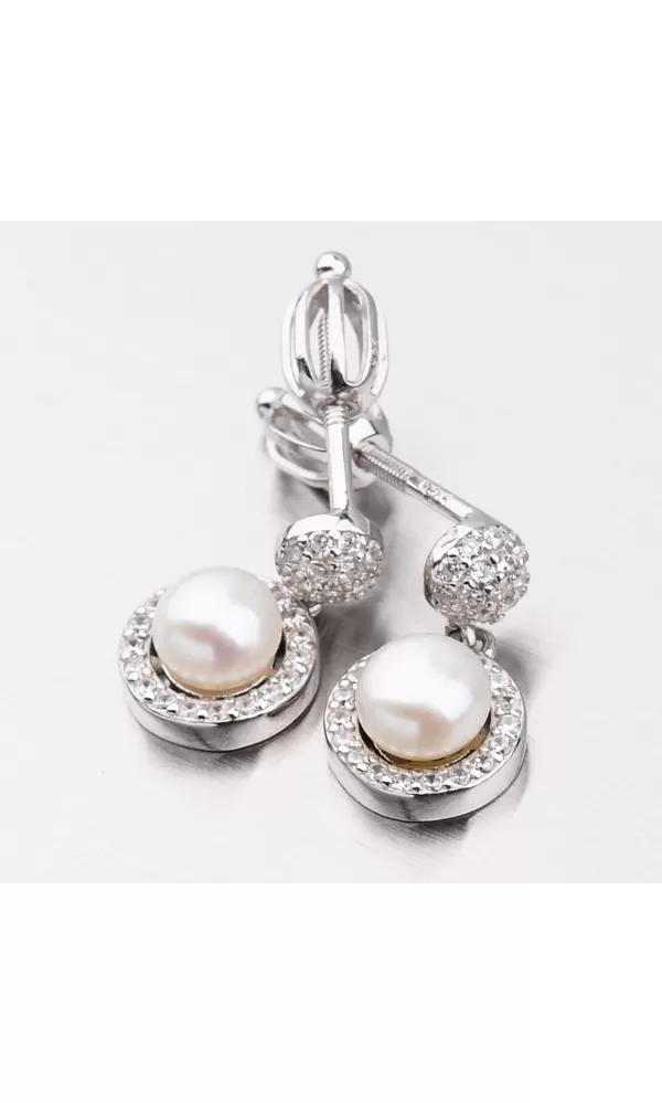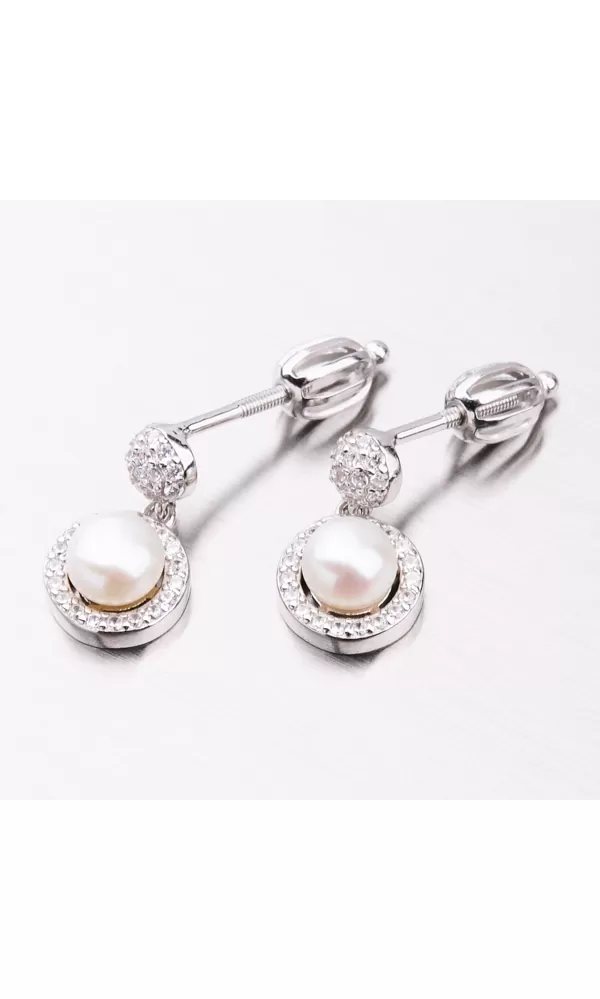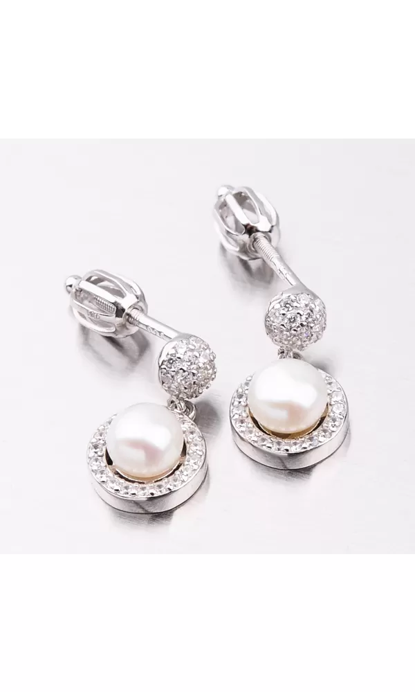 Luxusné dámske visiace náušnice oplývajú nekonečným leskom a krásou. Náušnice sú bohato vysadené zirkónmi v briliantovom bruse, ktoré vďaka tomuto brúsu žiaria ako pravé diamanty. Visiace náušnice sú tvorené príveskom v okrúhlom tvare, kde je pevne uchytená syntetická perla v bielej farbe. Tento luxus si môžete dopriať aj vy. Náušnice sa zapínajú na skrutku.