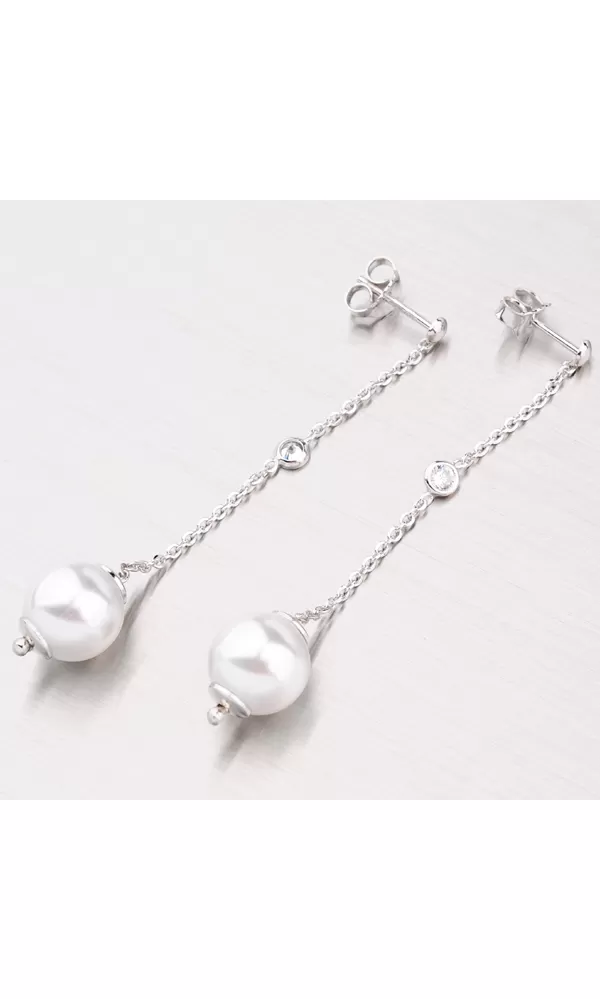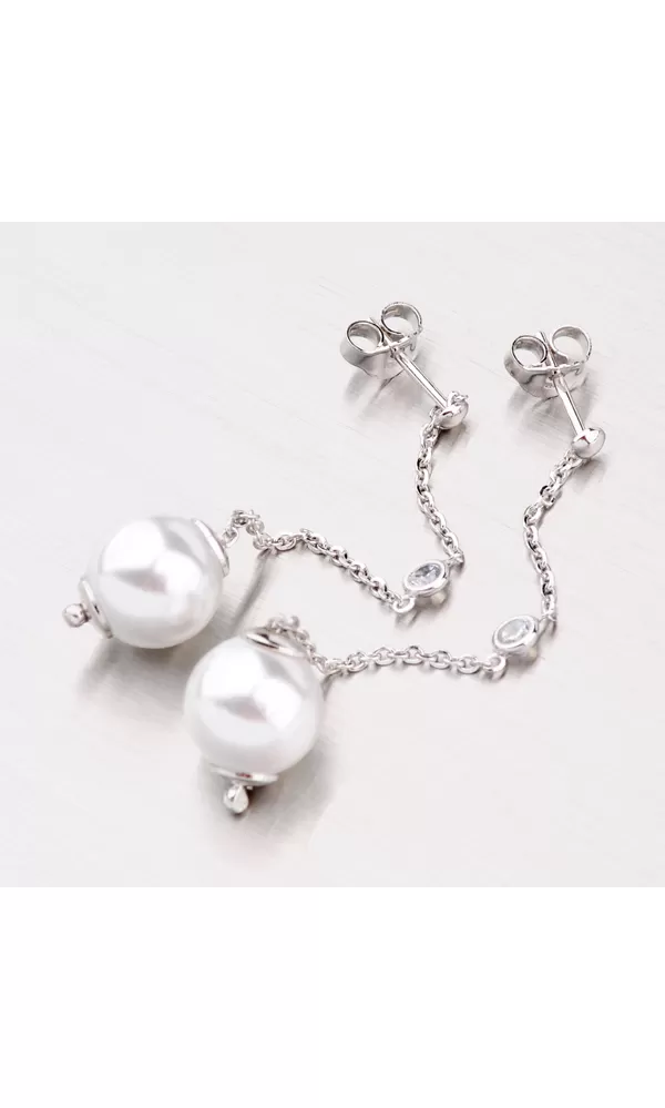 Elegantné dámske náušnice s ktorými budete neodolateľná. Náušnice sú vyrobené zo striebra rýdzosti 925/1000 s rhodiovaním. Strieborné náušnice sú tvorené z retiazky, na ktorej je na konci nádherná umelá biela perla. Uprostred náušníc je ešte trblietavý zirkón. Náušnice jednoducho zladíte s oblečením. Tieto krásne náušnice sú ešte navyše zdobené zirkónom, ktorý je umiestnený hneď pri uchu. Nikto Vaše náušnice neprehliadne a určite si vypočujete nejeden kompliment. Náušnice skvele doplnia Váš imidž. sú vhodné na každodenné nosenie.