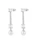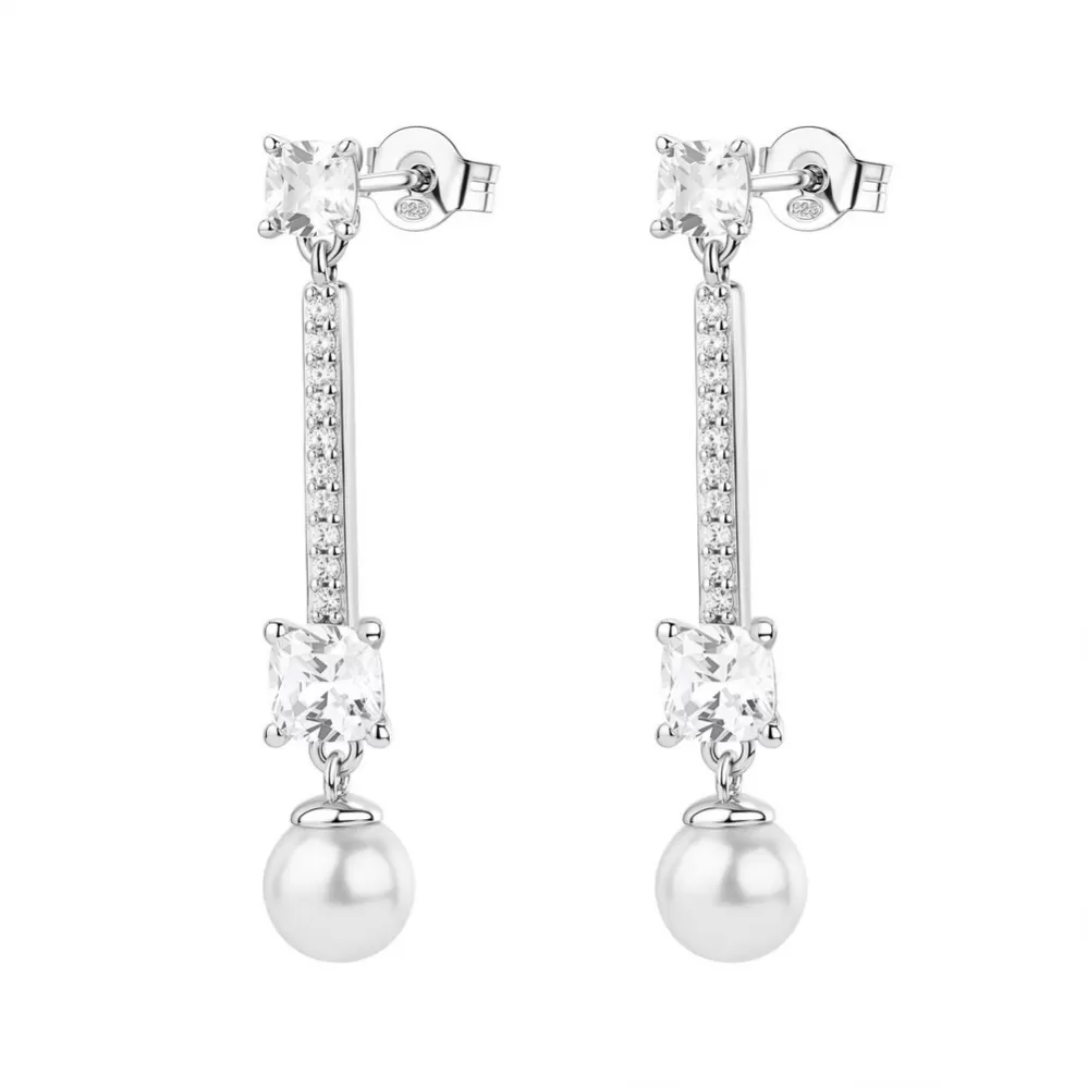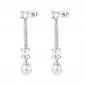Elegantné visiace náušnice sú štýlovým doplnkom pre ženu, ktorá hľadá spojenie jemnej krásy a nadčasovej elegancie. Dizajn náušníc vyniká visiacim tvarom s výškou cca 34,5 mm. Sú osadené čírymi kubickými zirkónmi, ktoré dodávajú jemný lesk a spodná časť je elegantne zdobená syntetickými perlami. Tento kontrast lesku a perleťového efektu vyzerá luxusne, no zároveň decentne.
