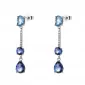 Dizajn náušníc zaujme závesným príveskom s dĺžkou cca 36,5 mm. Každá náušnica je osadená kombináciou čírych a modrých kubických zirkónov, ktoré vytvárajú očarujúci kontrast svetla a farieb. Modré kamene symbolizujú oporu, dôveru a pokoj, vďaka čomu náušnice vyzerajú elegantne a zároveň výrazne. Zapínanie je riešené klasickou prackou, ktorá zaručuje bezpečné a pohodlné nosenie po celý deň.