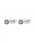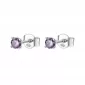 Decentné náušnice kôstky sú vyrobené z rhodiovaného striebra rýdzosti 925/1000 v lesklej povrchovej úprave. Ródium je ušľachtilý drahý kov zo skupiny platinových kovov. Rhodiovaním strieborných prsteňov galvanickým nanášaním tohto drahého kovu sa stáva povrch šperku tvrdší, stálejší a odolnejší voči vonkajším vplyvom ako je mechanický oter, poškriabanie, nabiehanie striebra, ľudský pot, kozmetické prípravky a ďalšie. Ródium je antialergické. Náušnice zdobia žiarivé kubické zirkóny vo fialovej farbe. Zirkóny sú brúsené do okrúhleho brusu, ktorý podporuje hravosť svetla pri každom Vašom pohybe. Náušnice sa zapínajú na puzety.