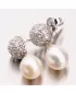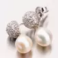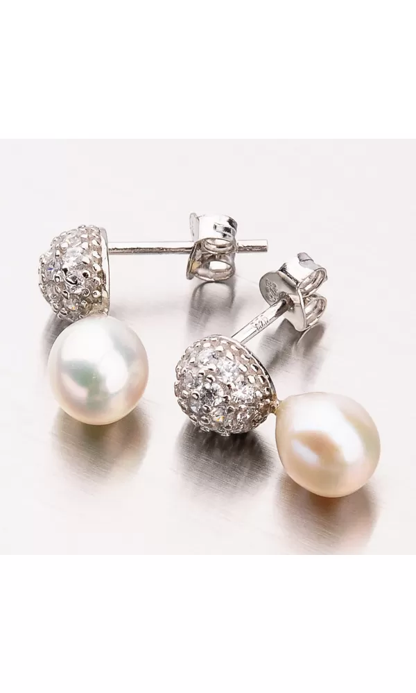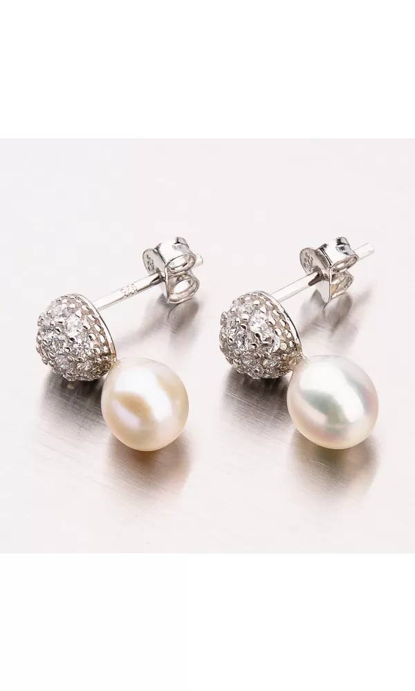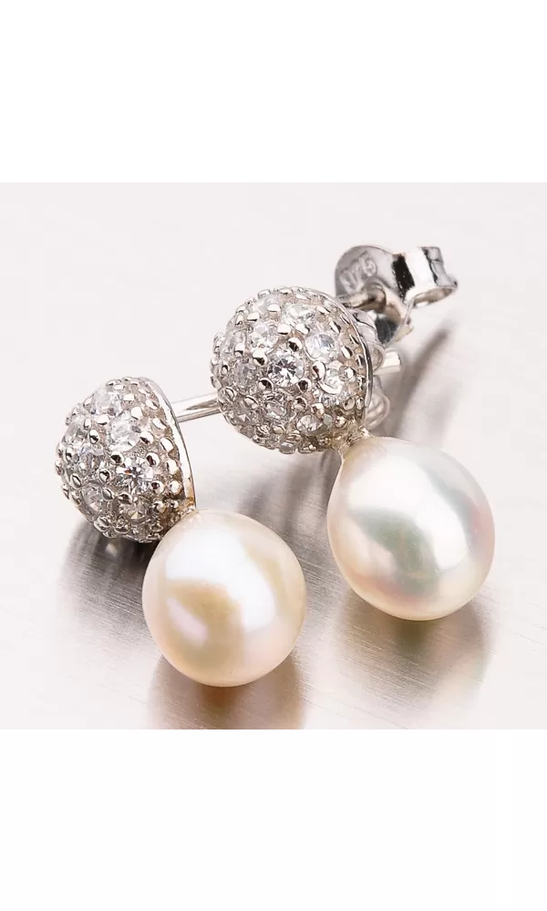 Tieto náušnice zaujmú syntetickou perlou oválneho tvaru, ktorá je uchytená za guličku, ktorá je celá vysadená zirkónmi v briliantovom bruse. N8ušnice sú pohodlné a zapínajú sa na puzete.