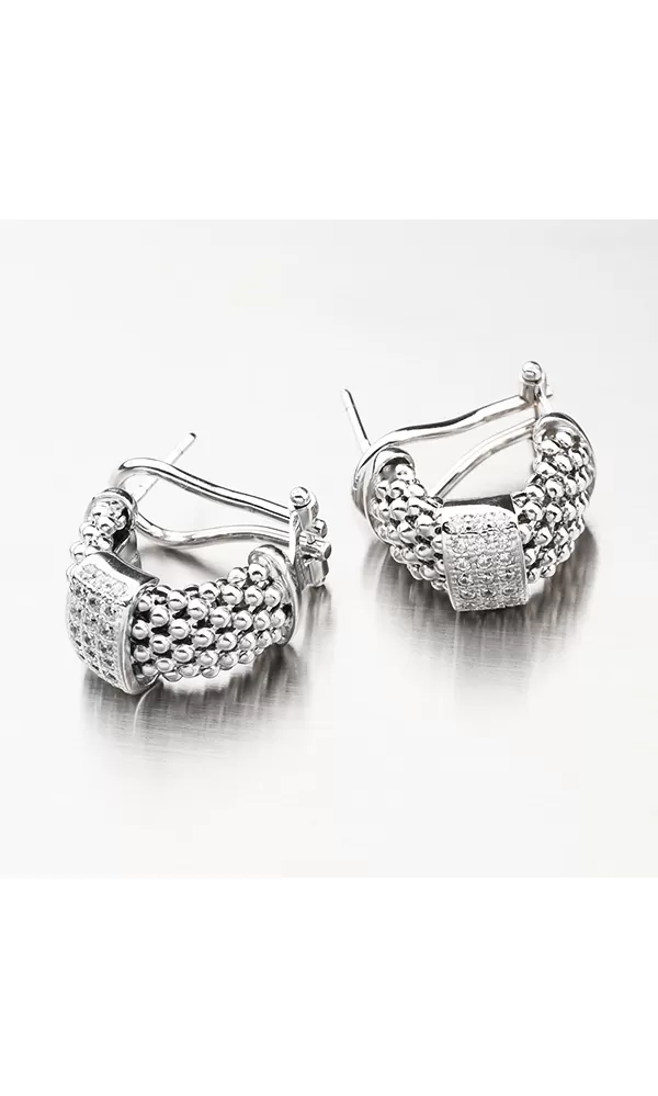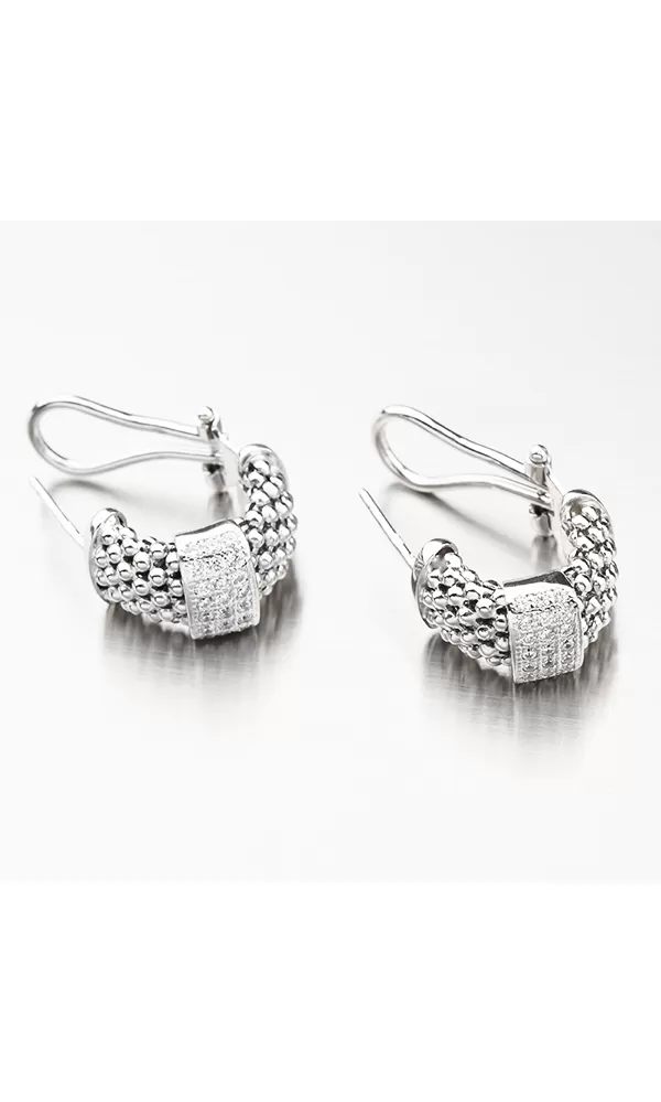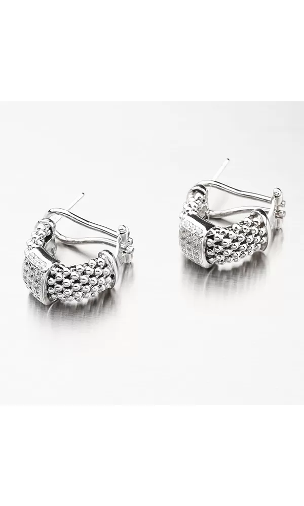 Osobité náušnice s tromi radmi zirkónov v briliantovom bruse. Tento brus dodáva zirkónom lesk skutočných diamantov.  Náušnice majú zapínanie podobné klope, kde sa spodná časť zacvakne, ale priamo na ucho a pevne drží. Vypínač je pohodlný a ľahko sa zapína.