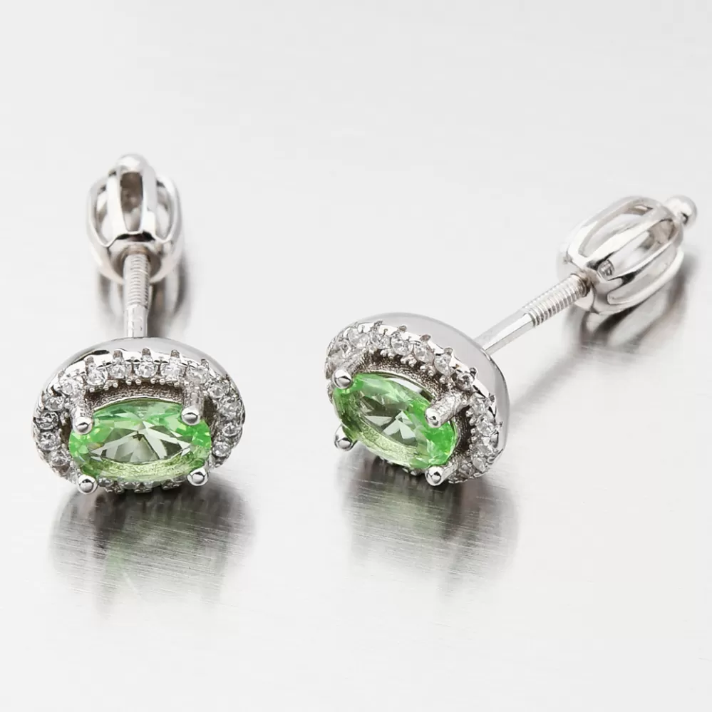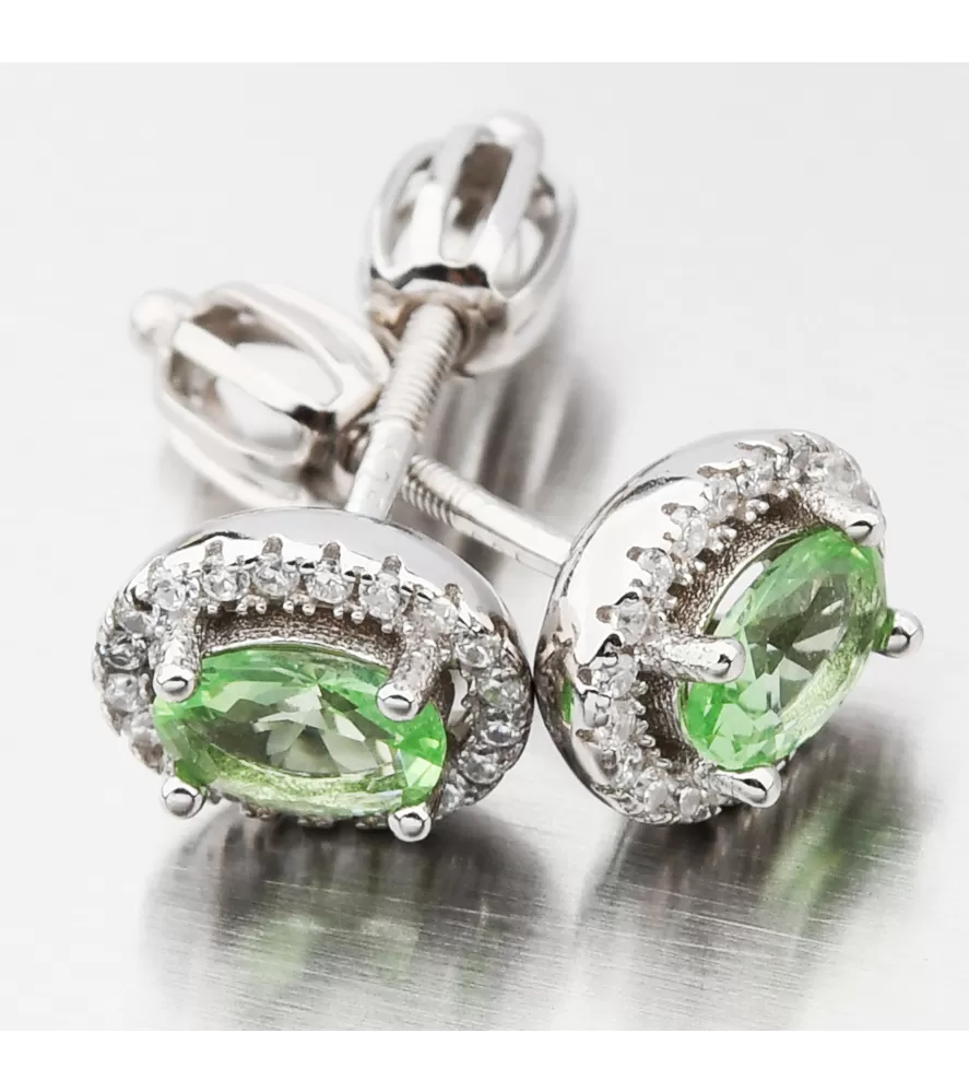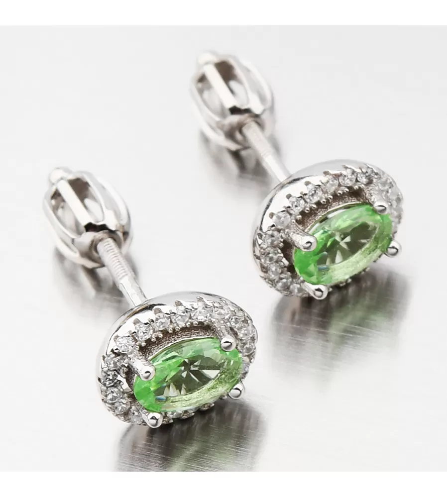 Pro milovnice zelené tu jsou tyto stříbrné náušnice pecky. Náušnice jsou v oválném tvaru zdobené velkým oválným zirkonem v zelené barvě a kolem něj jsou vsazeny menší zirkony v bílé barvě v briliantovém brusu. Náušnice se zapínají na šroubek.