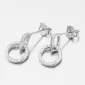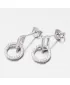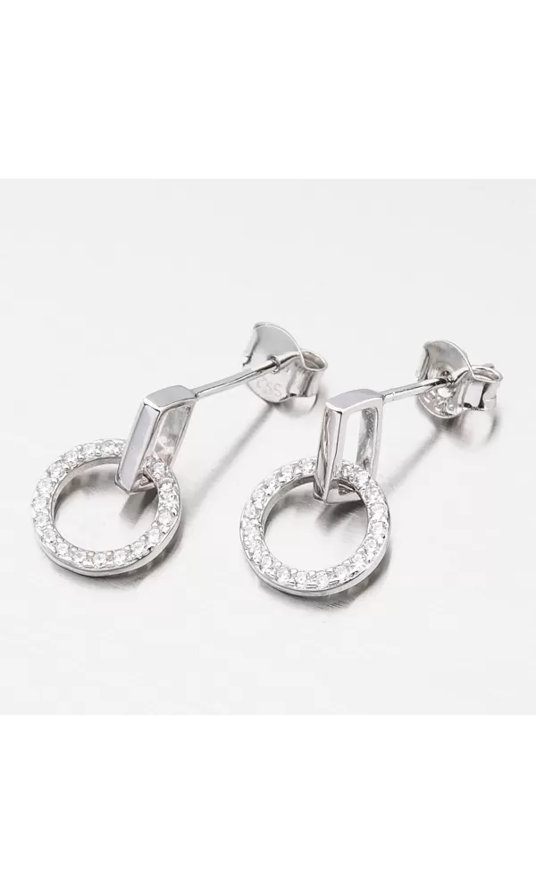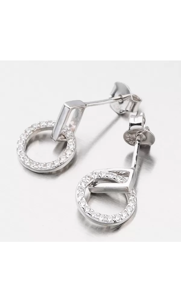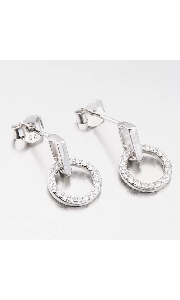 Elegantné náušnice sú tvorené obdĺžnikom, ktorý drží krúžok vysadený zirkónmi v briliantovom bruse. Krúžok voľne visí a rozohráva hru trbliet a lesku zirkónov, ktoré dokonale odrážajú svetlo. Náušnice sa zapínajú na puzetu.