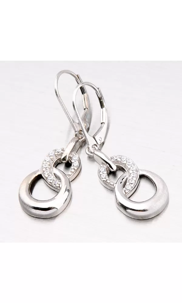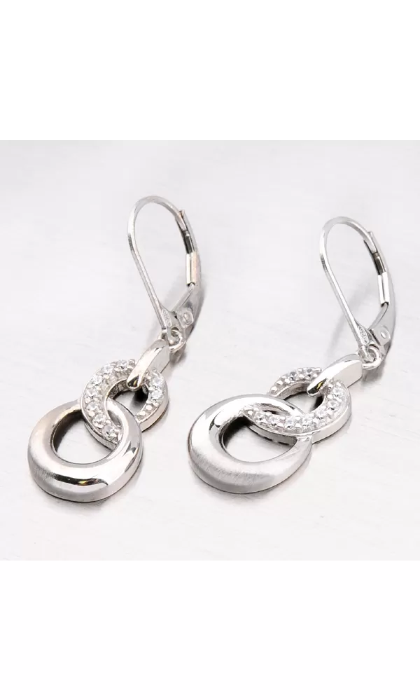 Visací náušnice jsou oblíbeným šperkem pro každou ženu. Je jich nepřeberné množství, tvarů a designů. Tento model patří do elegantnějších modelů s jemnými rysy liniemi. Náušnice jsou tvořeny přívěskem ve tvaru osmičky, která je zdobená zářivými zirkony kulatého brusu. Jejich precizní broušení zaručí dokonalý lesk, který nikdo nepřehlédne. Zapínání těchto náušnic je na klapku.