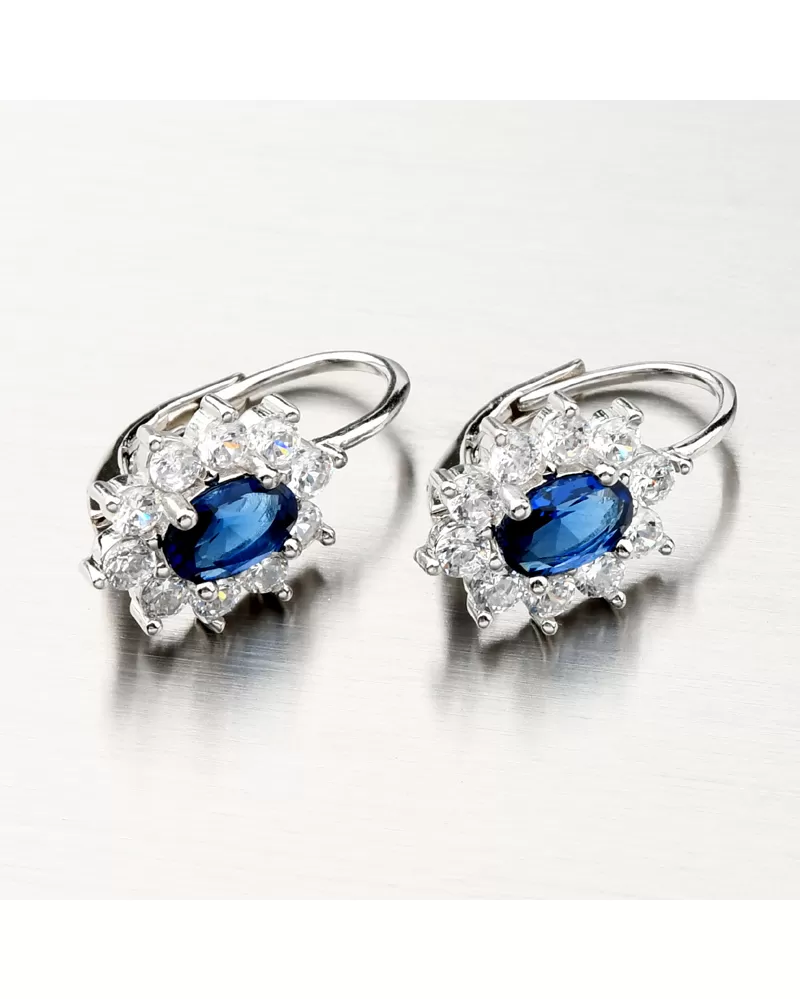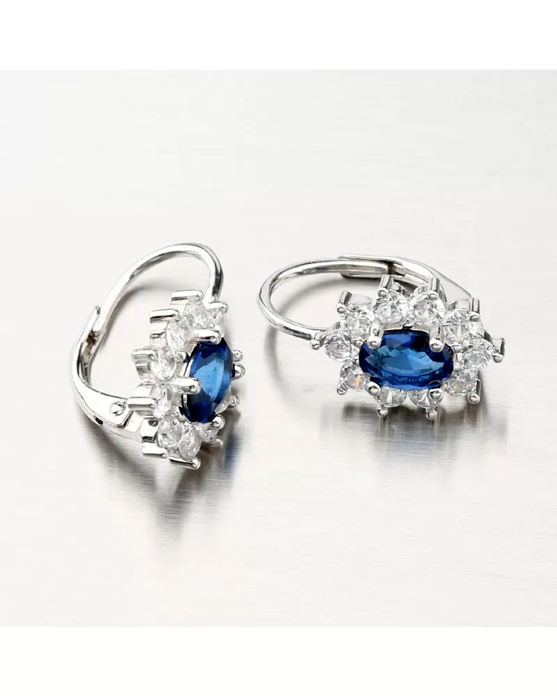 Úchvatné strieborné náušnice s dominantným tmavomodrým oválnym zirkónom, ktorý je na pevno usadený do krapien a okolo neho je vysadených 10 žiarivých zirkónov po celom obvode. Náušnice budú vďaka svojej veľkosti vhodné aj pre staršie dievčatá.