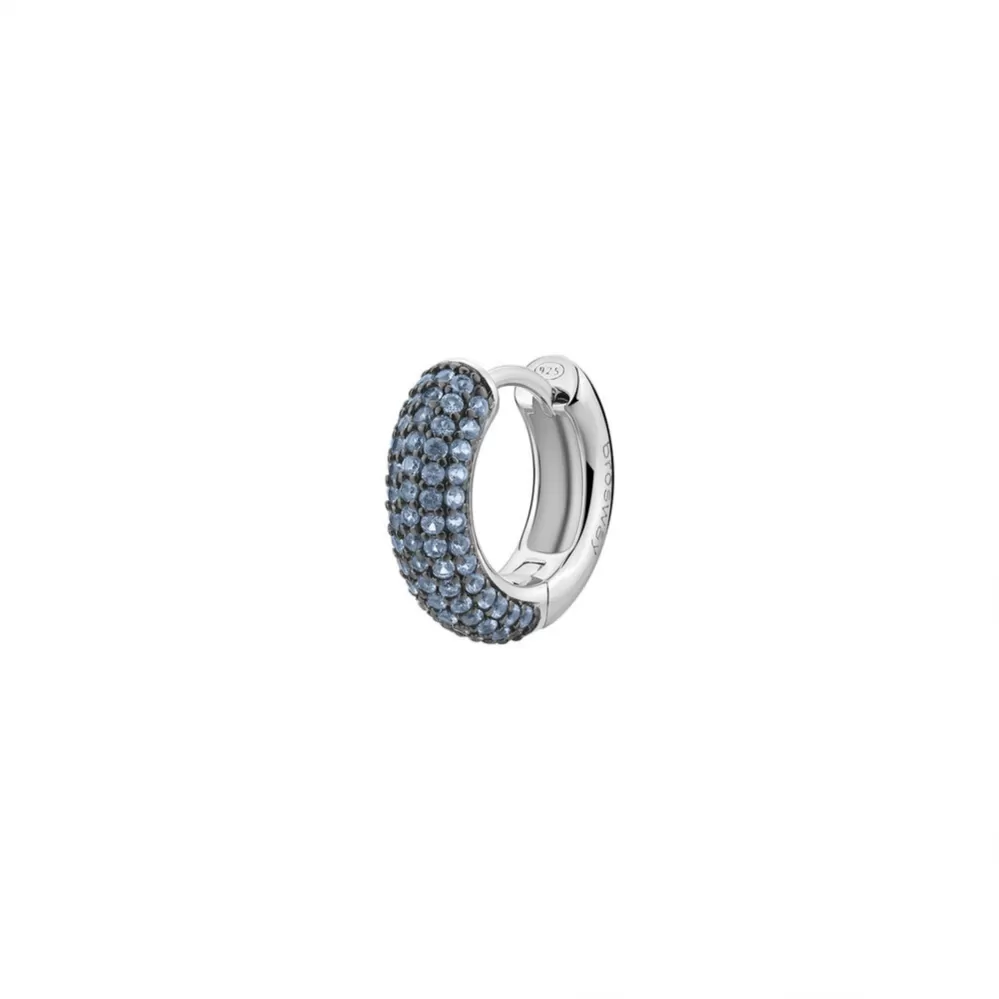 Single náušnice je vyrobená z rhodiovaného striebra rýdzosti 925/1000 v lesklej povrchovej úprave. Ródium je ušľachtilý drahý kov zo skupiny platinových kovov. Rhodiovaním strieborných prsteňov galvanickým nanášaním tohto drahého kovu sa stáva povrch šperku tvrdší, stálejší a odolnejší voči vonkajším vplyvom ako je mechanický oter, poškriabanie, nabiehanie striebra, ľudský pot, kozmetické prípravky a ďalšie. Ródium je antialergické. Náušnice v tvare kruhu je vysadená kubickými zirkónmi.