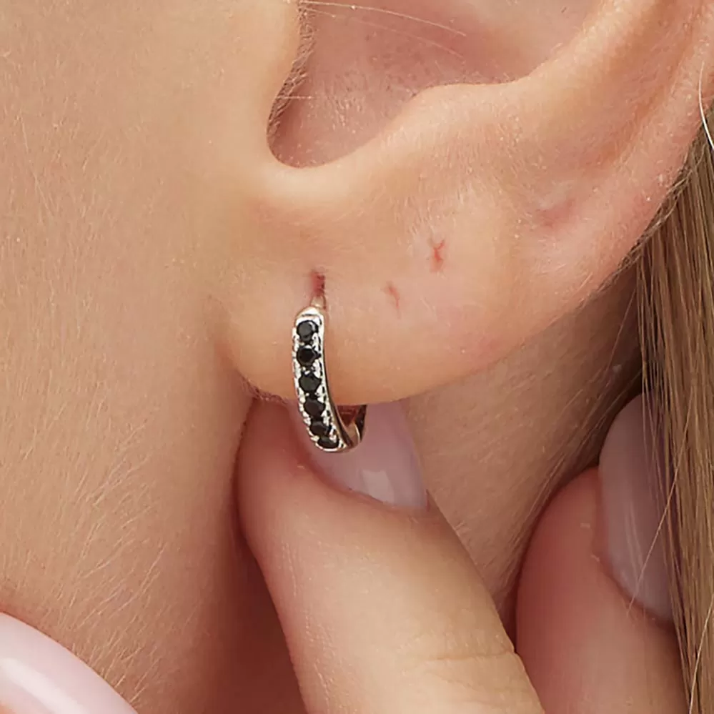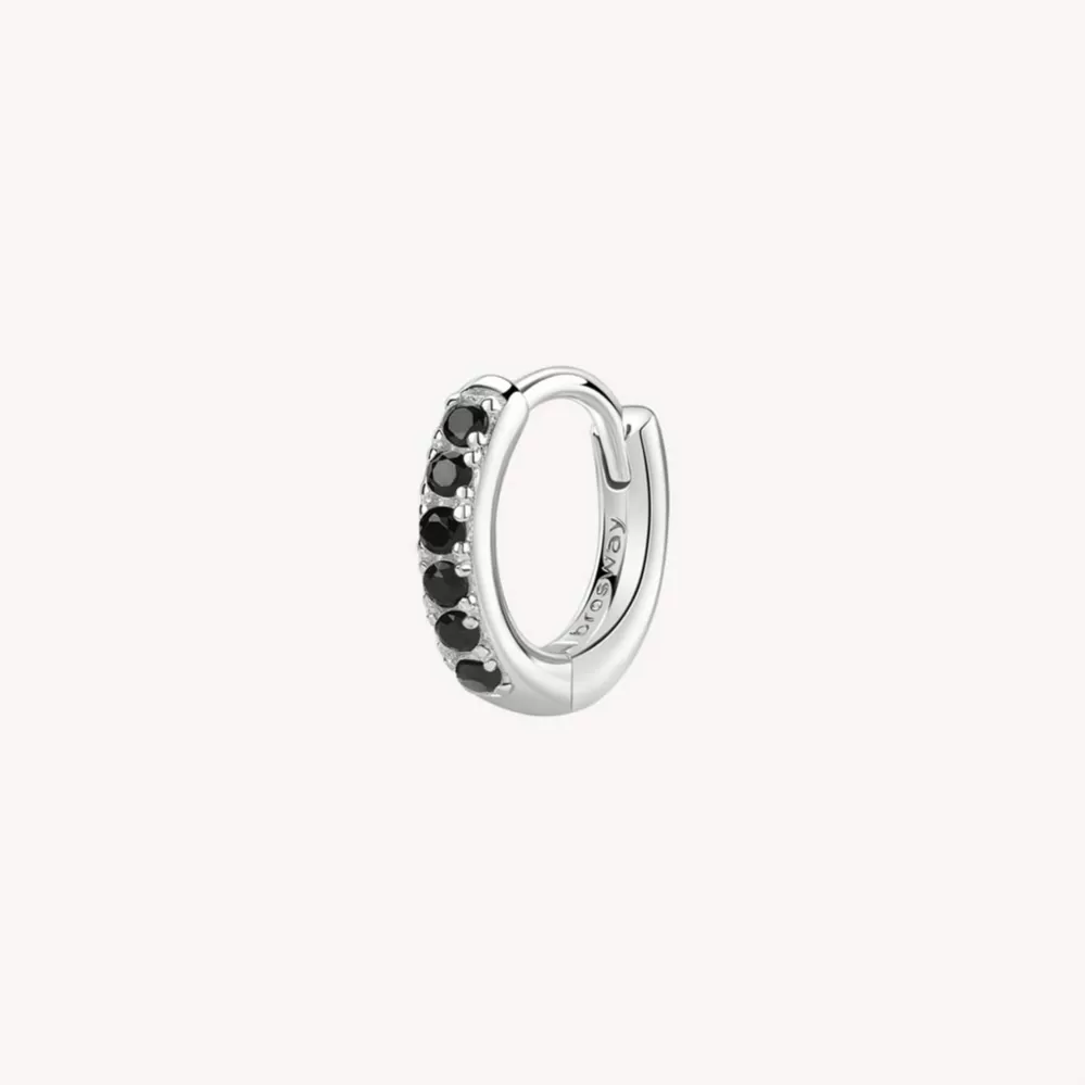 Single náušnice je vyrobená z rhodiovaného striebra rýdzosti 925/1000 v lesklej povrchovej úprave. Ródium je ušľachtilý drahý kov zo skupiny platinových kovov. Rhodiovaním strieborných prsteňov galvanickým nanášaním tohto drahého kovu sa stáva povrch šperku tvrdší, stálejší a odolnejší voči vonkajším vplyvom ako je mechanický oter, poškriabanie, nabiehanie striebra, ľudský pot, kozmetické prípravky a ďalšie. Ródium je antialergické. Náušnice v tvare kruhu je vysadená kubickými zirkónmi.