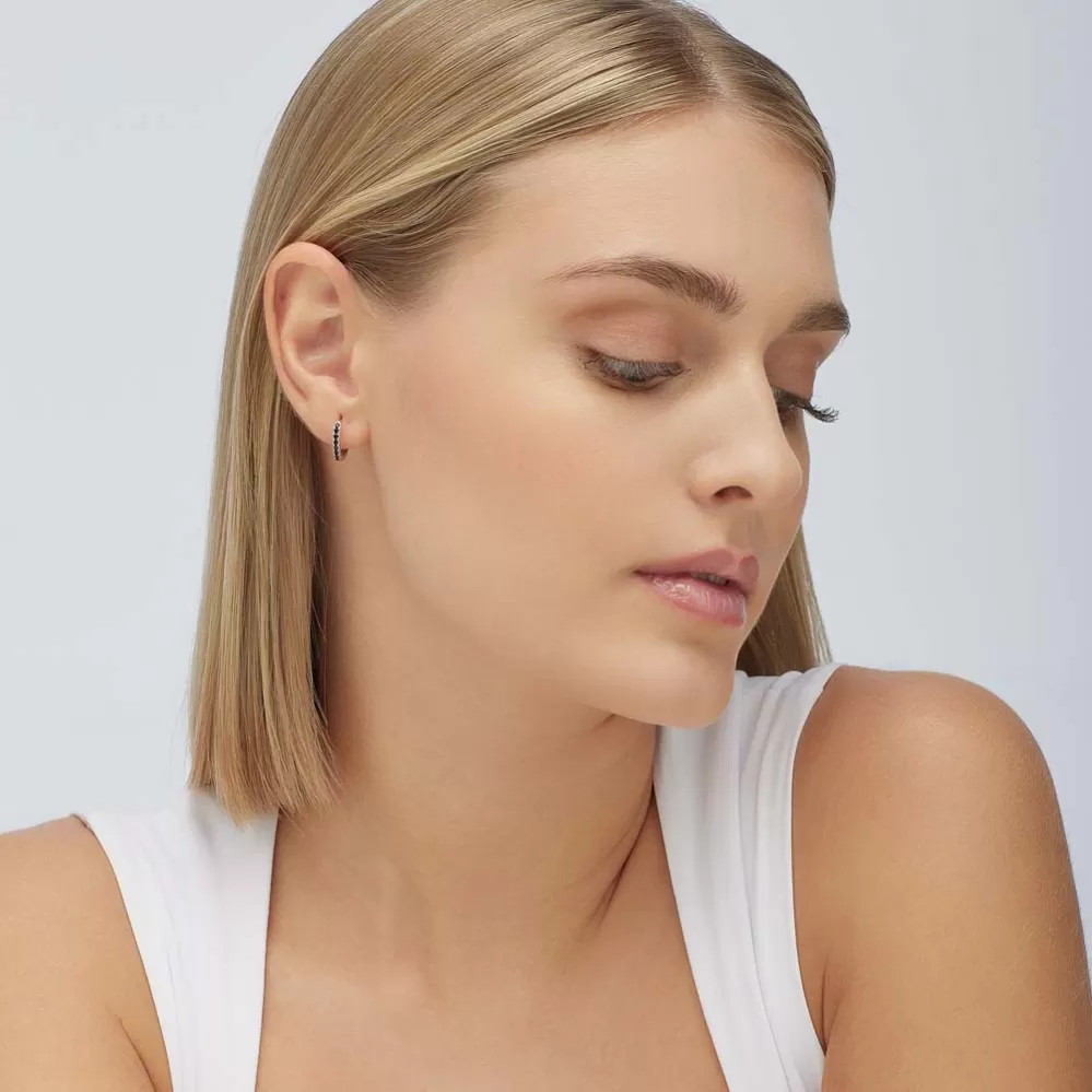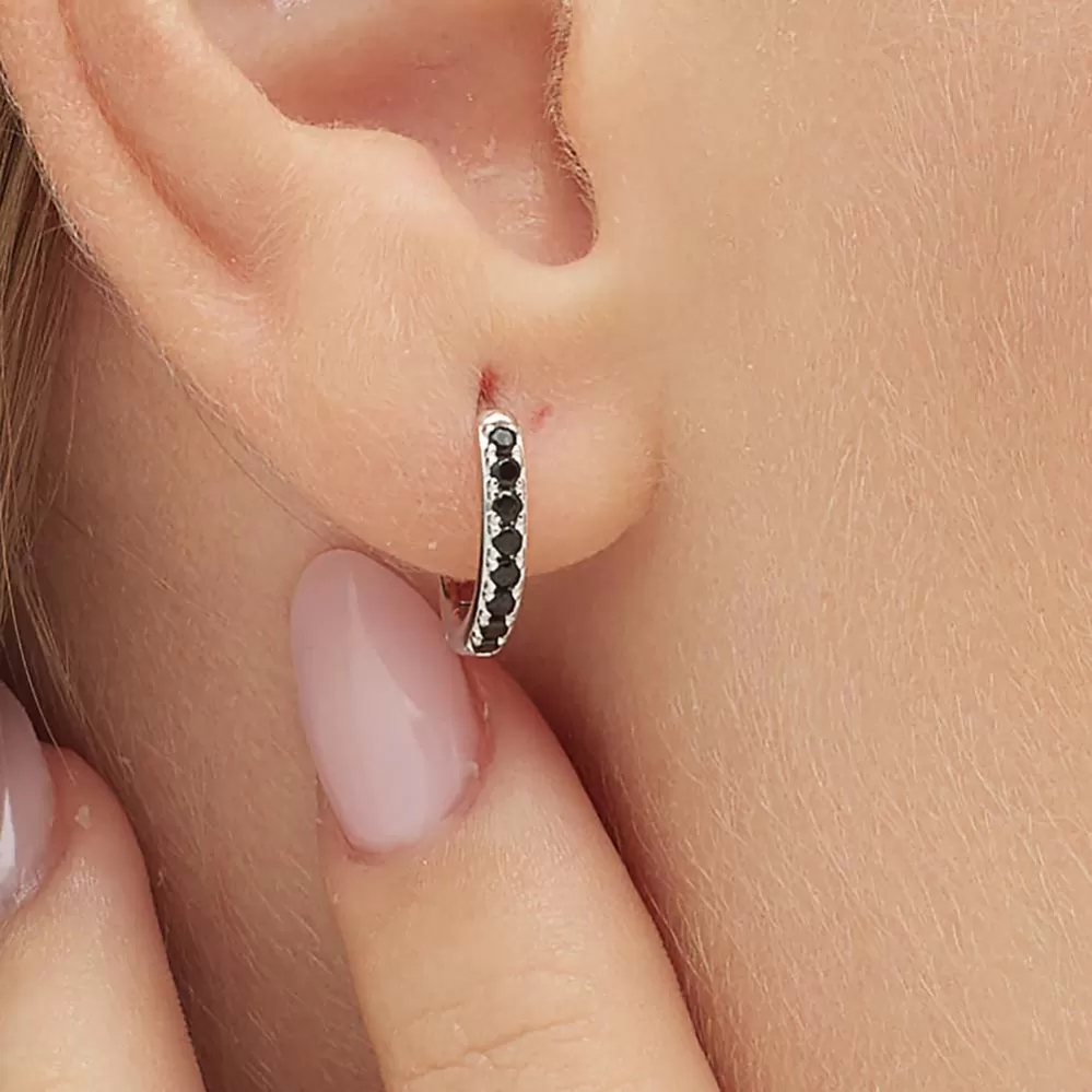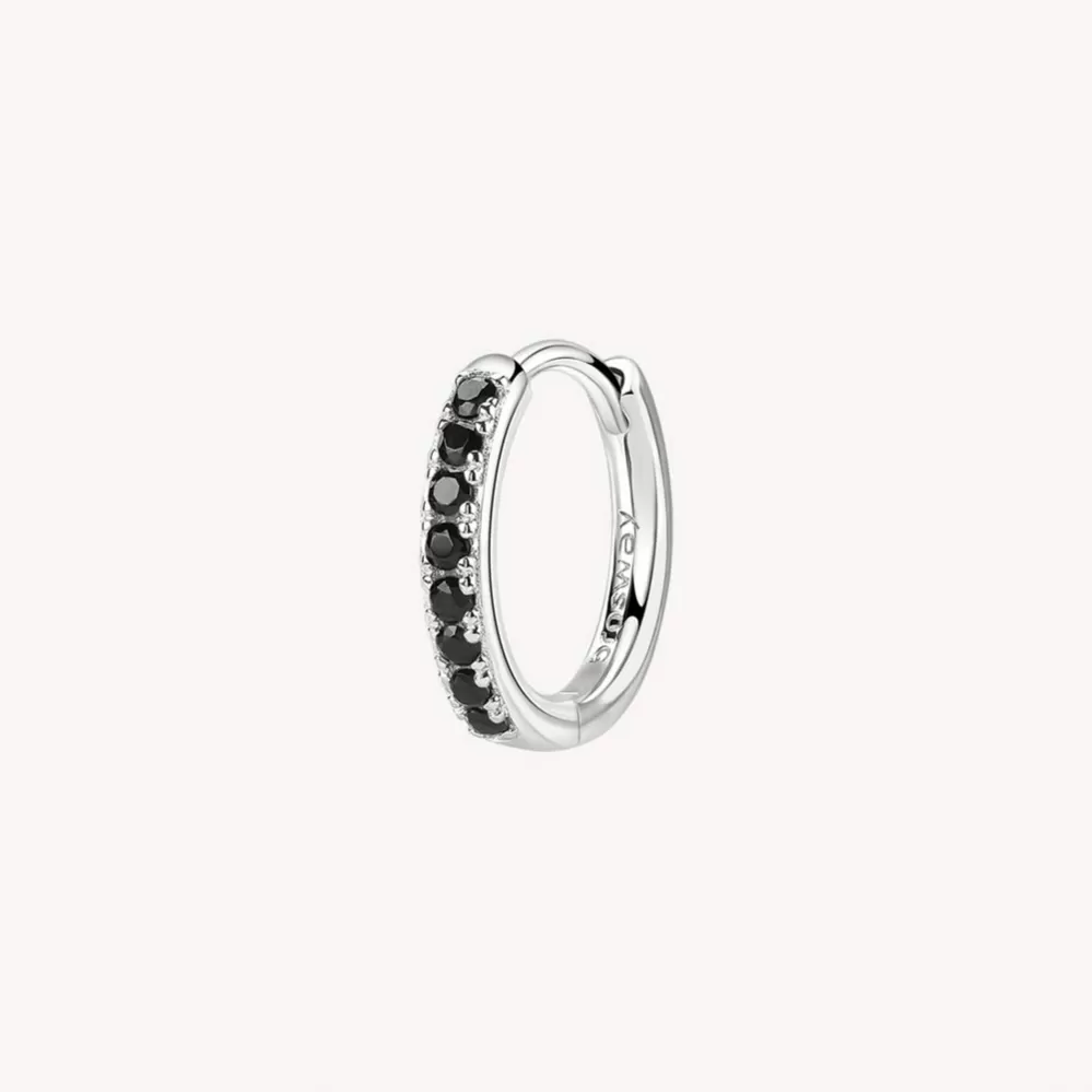 Single náušnice je vyrobená z rhodiovaného striebra rýdzosti 925/1000 v lesklej povrchovej úprave. Ródium je ušľachtilý drahý kov zo skupiny platinových kovov. Rhodiovaním strieborných prsteňov galvanickým nanášaním tohto drahého kovu sa stáva povrch šperku tvrdší, stálejší a odolnejší voči vonkajším vplyvom ako je mechanický oter, poškriabanie, nabiehanie striebra, ľudský pot, kozmetické prípravky a ďalšie. Ródium je antialergické. Náušnice v tvare kruhu je vysadená kubickými zirkónmi.