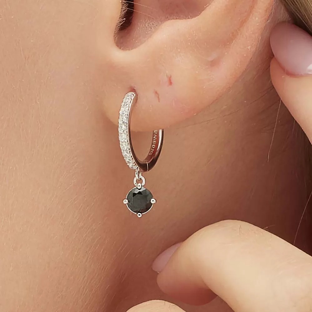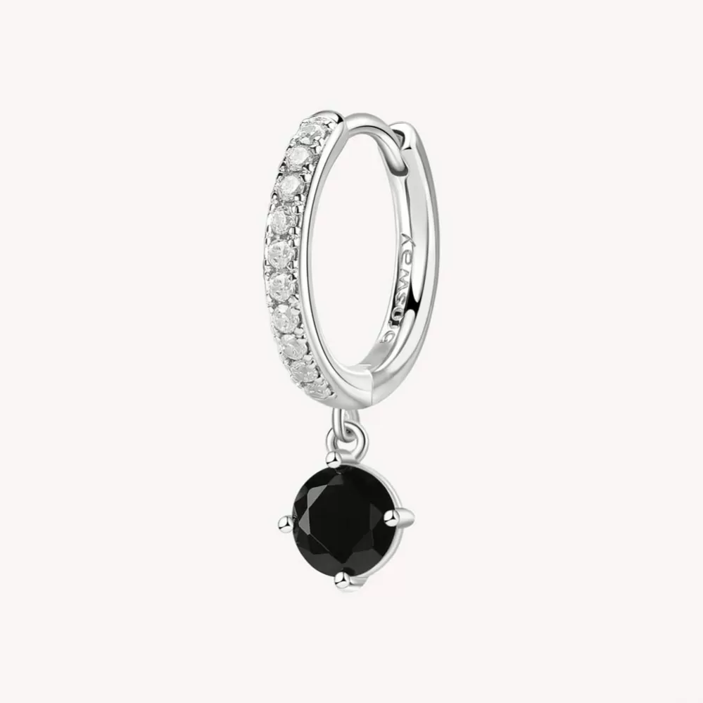 Single náušnice je vyrobená z rhodiovaného striebra rýdzosti 925/1000 v lesklej povrchovej úprave. Ródium je ušľachtilý drahý kov zo skupiny platinových kovov. Rhodiovaním strieborných prsteňov galvanickým nanášaním tohto drahého kovu sa stáva povrch šperku tvrdší, stálejší a odolnejší voči vonkajším vplyvom ako je mechanický oter, poškriabanie, nabiehanie striebra, ľudský pot, kozmetické prípravky a ďalšie. Ródium je antialergické. Visiace náušnice zdobia žiarivé zirkóny precízne brúsené tak, aby sa rozžiarili každým Vašim pohybom.