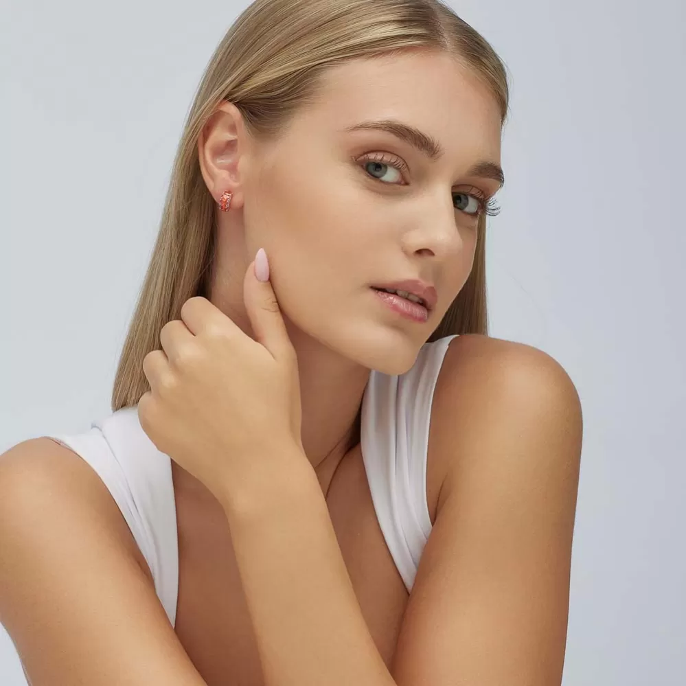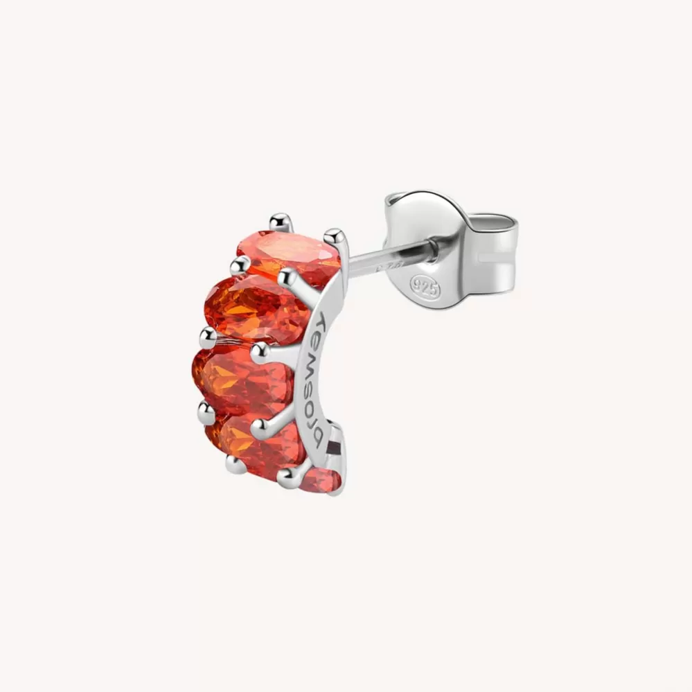 Nový trend medzi náušnicami sú náušnice, ktoré sa predávajú po len kuse. Tento model vo forme polokrúžku je vyrobený zo striebra rýdzosti 925/1000 v lesklej povrchovej úprave. Single náušnice je zdobená kubickými zirkónmi v oranžovej farbe. Náušnice sa zapínajú na puzetu. Šperk je rhodiovaný. Ródium je ušľachtilý drahý kov zo skupiny platinových kovov. Rhodiovaním strieborných prsteňov galvanickým nanášaním tohto drahého kovu sa stáva povrch šperku tvrdší, stálejší a odolnejší voči vonkajším vplyvom ako je mechanický oter, poškriabanie, nabiehanie striebra, ľudský pot, kozmetické prípravky a ďalšie.