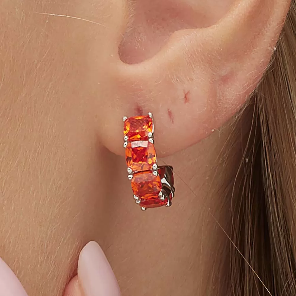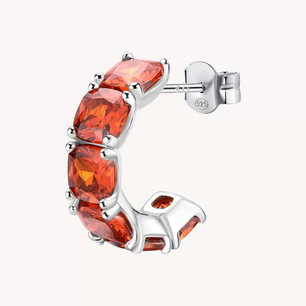 Nový trend medzi náušnicami sú náušnice, ktoré sa predávajú po len kuse. Tento model vo forme polokrúžku je vyrobený zo striebra rýdzosti 925/1000 v lesklej povrchovej úprave. Single náušnice je zdobená kubickými zirkónmi v oranžovej farbe. Náušnice sa zapínajú na puzetu. Šperk je rhodiovaný. Ródium je ušľachtilý drahý kov zo skupiny platinových kovov. Rhodiovaním strieborných prsteňov galvanickým nanášaním tohto drahého kovu sa stáva povrch šperku tvrdší, stálejší a odolnejší voči vonkajším vplyvom ako je mechanický oter, poškriabanie, nabiehanie striebra, ľudský pot, kozmetické prípravky a ďalšie. Ródium je antialergické.