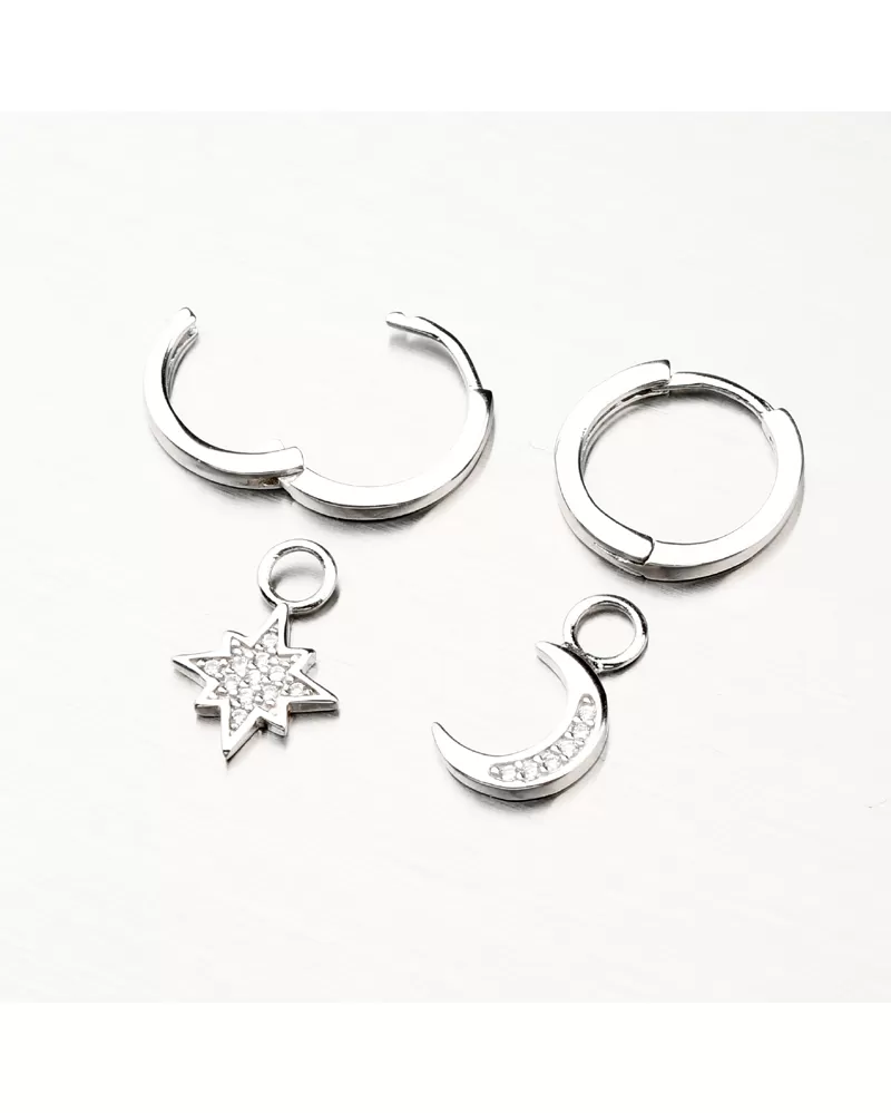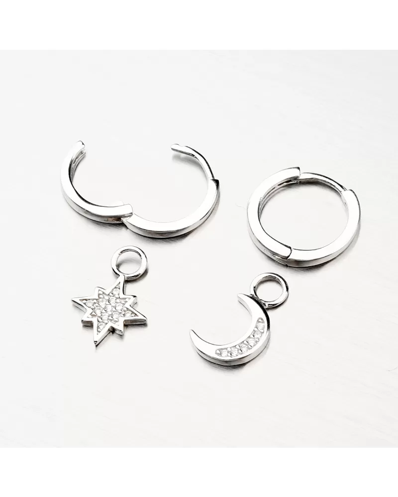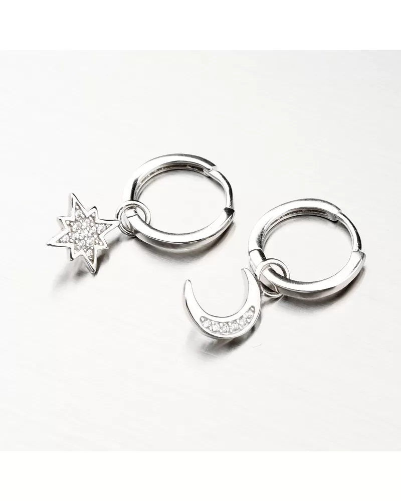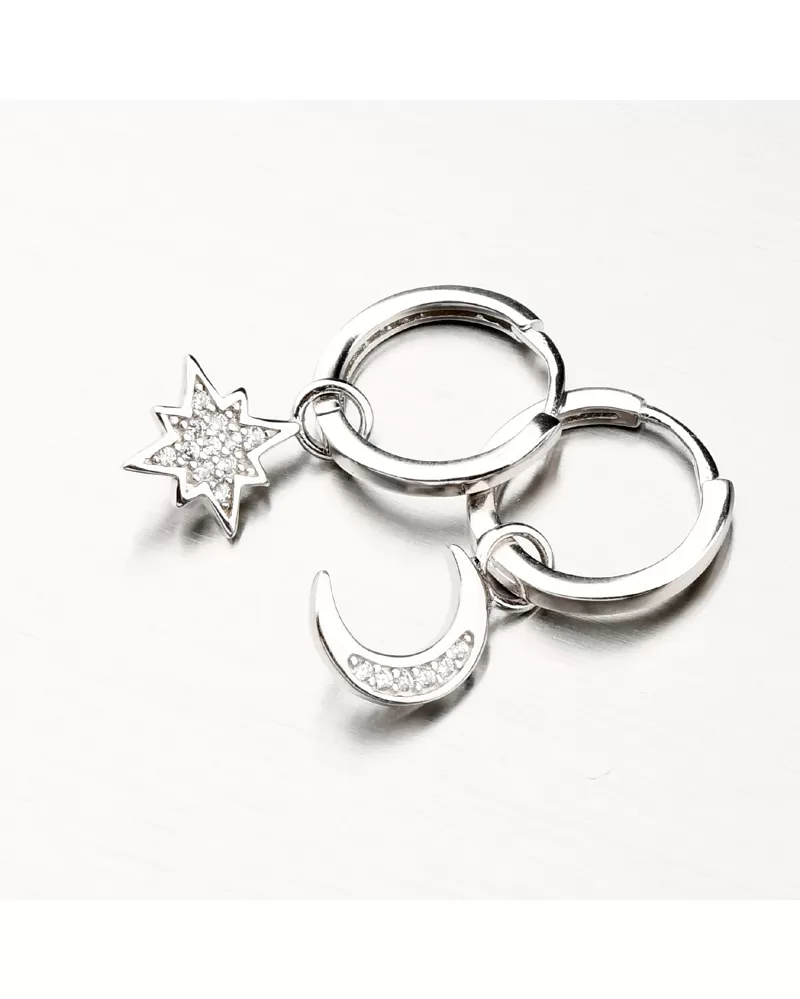Moderné náušnice od Stříbro. Prstene sú vo vysokom lesku a sú zdobené pohyblivými príveskami. Je zaujímavé, že každý prívesok je iný - jeden je mesiac na jednej a druhej hviezde. Prívesky sú zdobené žiarivými zirkónmi v brilantnom strihu, ktorý dodáva maximálny lesk. Vďaka ich konštrukcii sú náušnice vhodné na každodenné nosenie a spolu s fantastickým upevnením, ktoré jednoducho zachytávajú a držia, budú ideálnym klenotom.