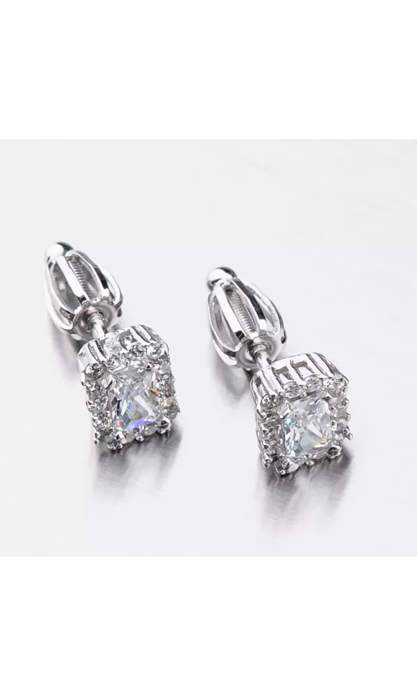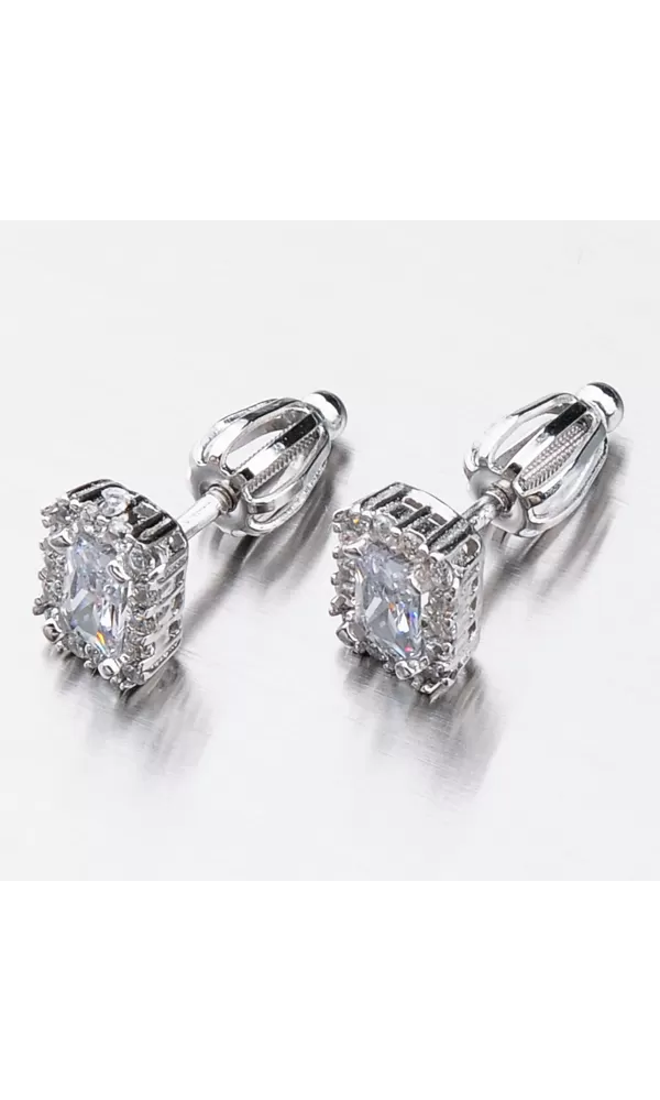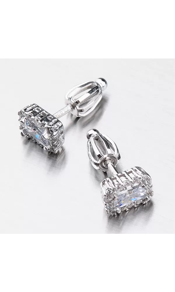 Náušnice sú v hranatom tvare zdobené stredovým zirkónom, ktorý je brúsený do tvaru obdĺžnika. Okolo tohto zirkónu sú vsadené menšie zirkóny v briliantovom bruse. Bola by škoda stratiť tento šperk, preto je zvolené zapínanie na skrutku, ktoré je bezpečné.
