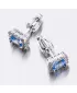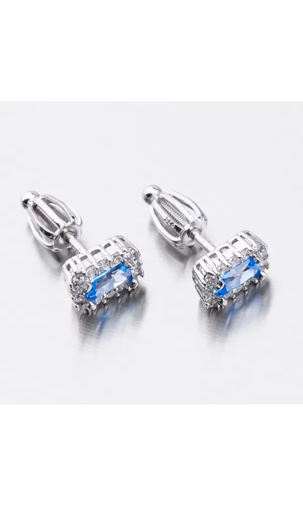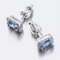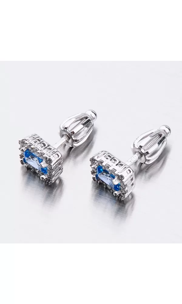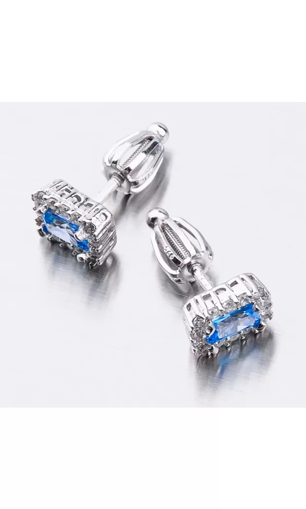 Náušnice sú v hranatom tvare zdobené stredovým zirkónom v modrej farbe, ktorý je brúsený do tvaru obdĺžnika. Okolo tohto zirkónu sú vsadené menšie zirkóny v briliantovom bruse. Bola by škoda stratiť tento šperk, preto je zvolené zapínanie na skrutku, ktoré je bezpečné.