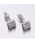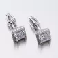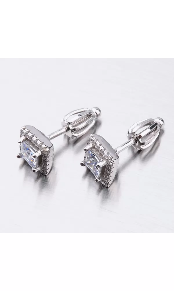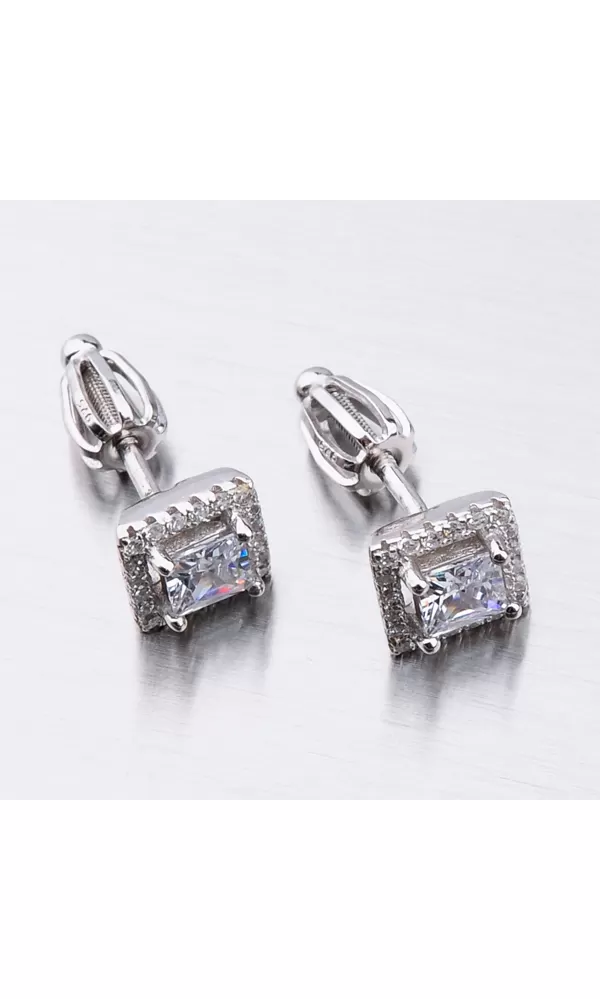 Náušnice sú v hranatom tvare zdobené stredovým zirkónom, ktorý je brúsený do tvaru princes. Okolo tohto zirkónu sú vsadené menšie zirkóny v briliantovom bruse. Bola by škoda stratiť tento šperk preto je zvolené zapínanie na skrutku, ktoré je bezpečné.