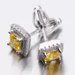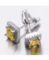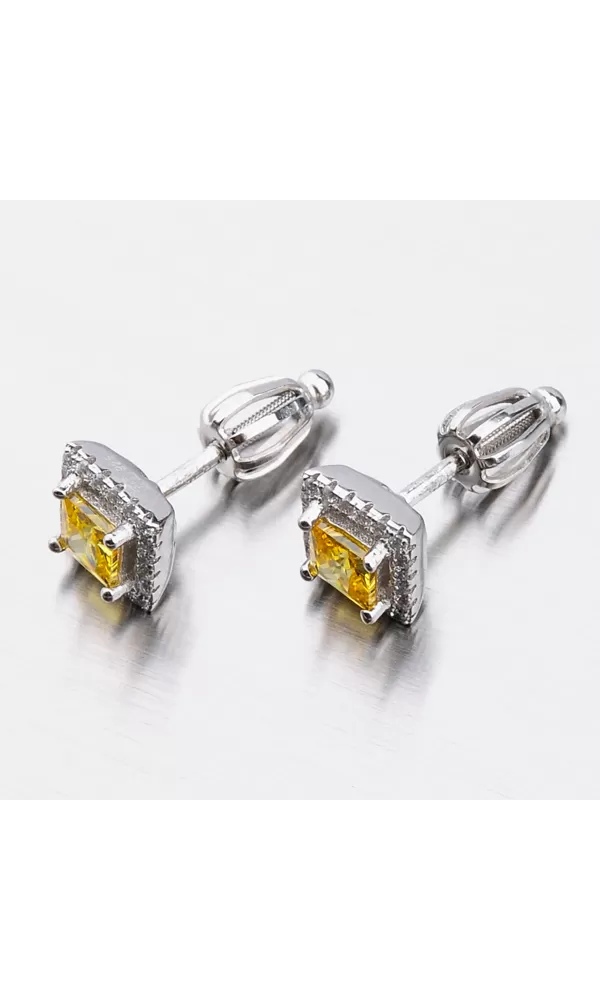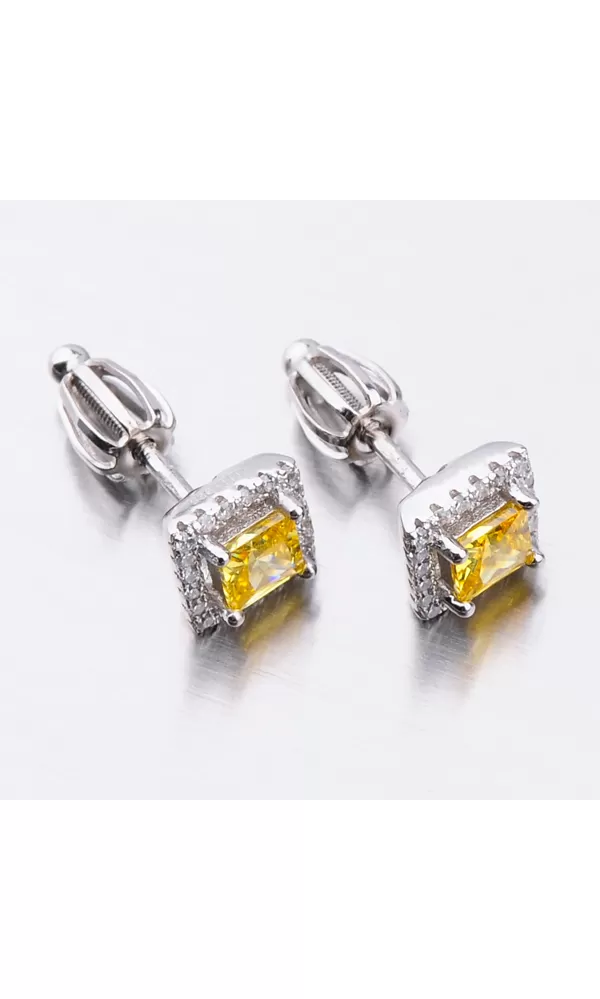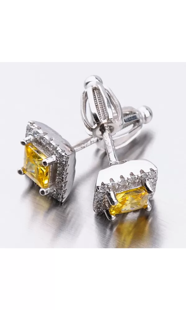 Náušnice sú v hranatom tvare zdobené stredovým zirkónom v žltej farbe, ktorý je brúsený do tvaru princesa. Okolo tohto zirkónu sú vsadené menšie zirkóny v briliantovom bruse.