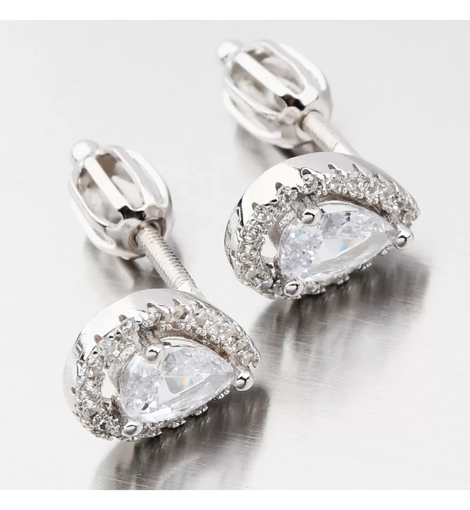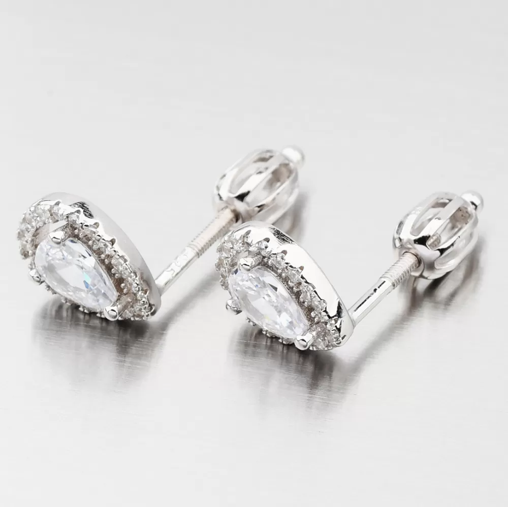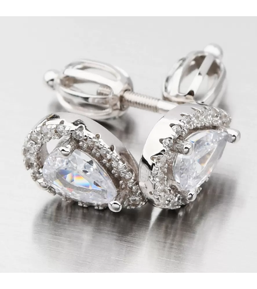 Elegantní náušnice pecky ve tvaru kapky zdobí velký zirkon ve stejném tvaru. Kolem tohoto zirkonu jsou vsazeny menší zirkony v briliantovém brusu. Náušnice se zapínají na šroubek.