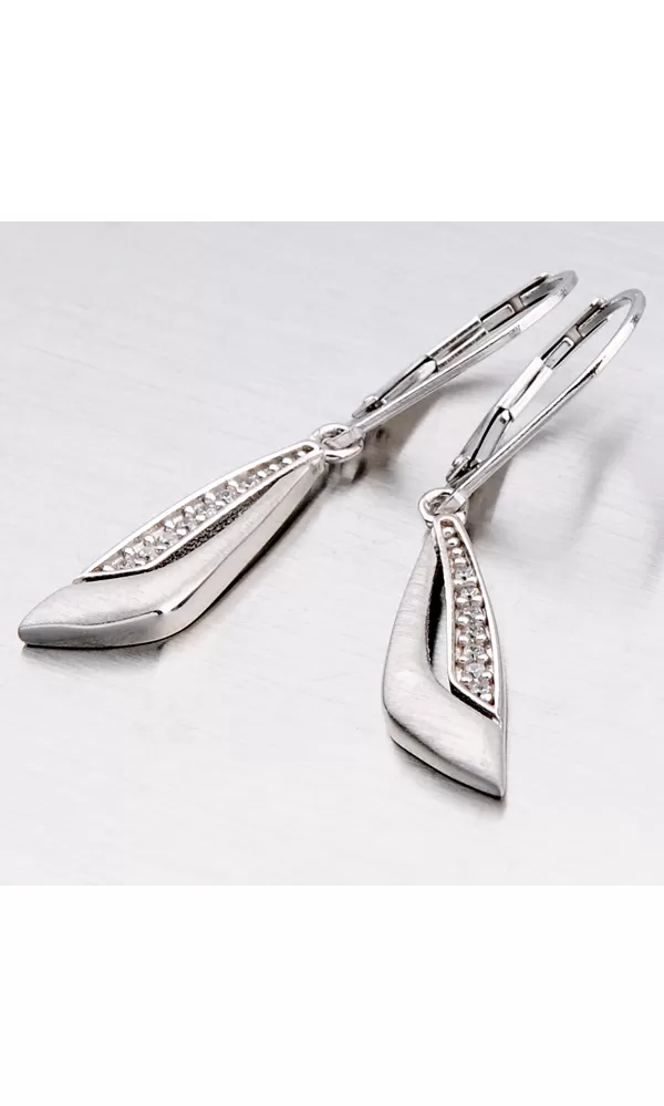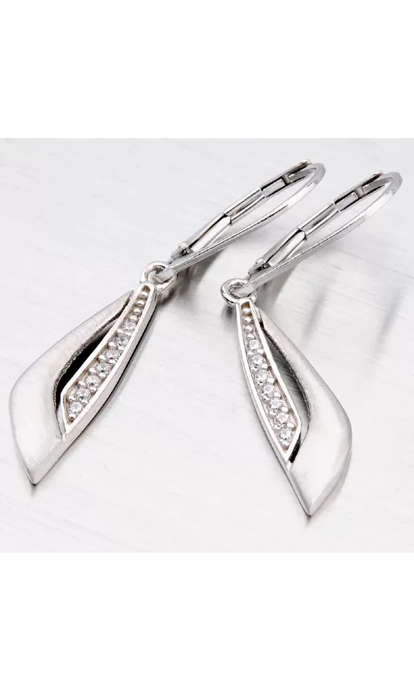 Další mimořádný kousek z naší dílny jsou tyto stříbrné náušnice zdobené zirkony, které jsou vsazené v řadě za sebou. Náušnice jsou tvořeny ozdobou, která je v kombinaci lesklé a matné povrchové úpravě a průřezem, který odděluje zirkonovou část od matné. Zapínání těchto náušnic je na klapku.