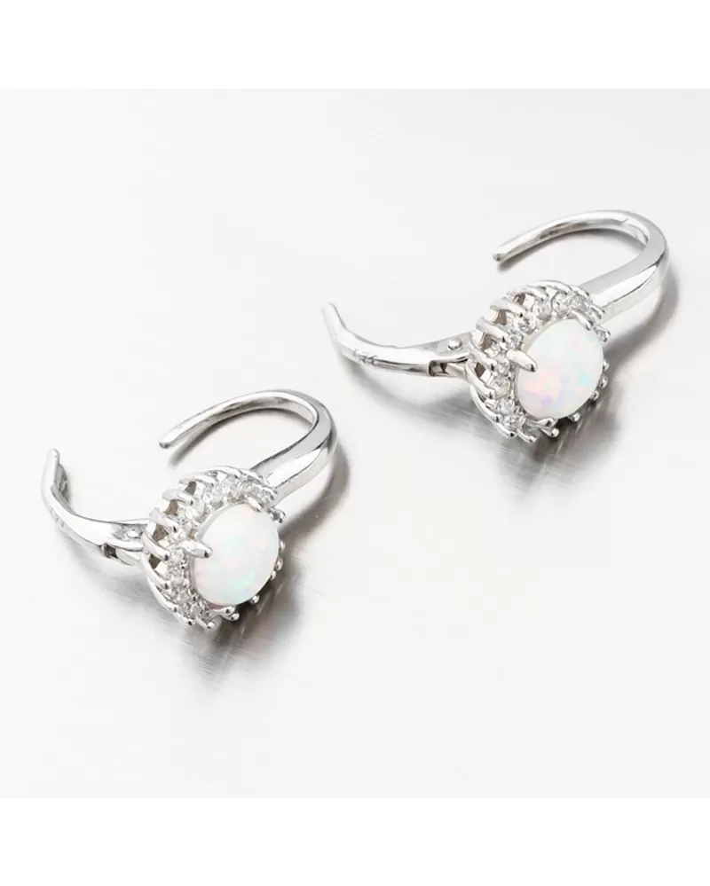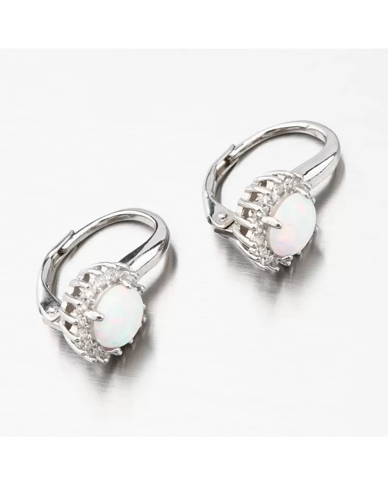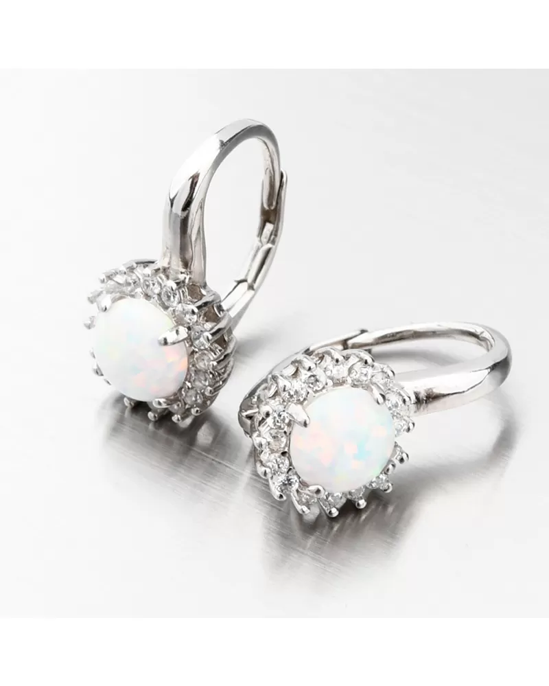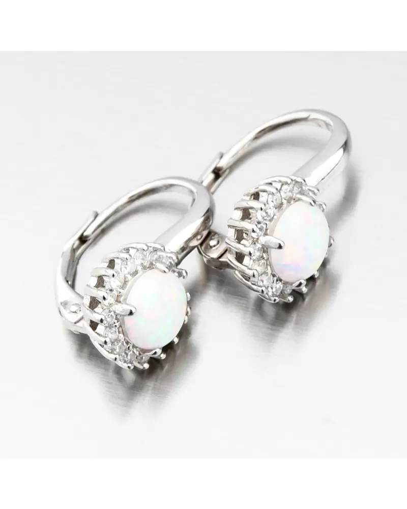 Výrazné strieborné náušnice osadené syntetickým opálom v bielej farbe, ktorý má nádherné dúhové odlesky. Náušnice sú navyše ozdobené trblietavými zirkónmi po celom obvode. Zirkóny sú brúsené do briliantového brusu, ktorý prepožičiava kameňom brilanciu pravých diamantov. Dizajn náušníc je elegantný a zažiarite s nimi pri všetkých príležitostiach. Biela farba opálu je symbolom večnej lásky, preto týmito náušnicami urobíte radosť svojej milovanej polovičke. Alebo je druhý variant, že tento opál môže byť použitý na privedenie novej lásky.