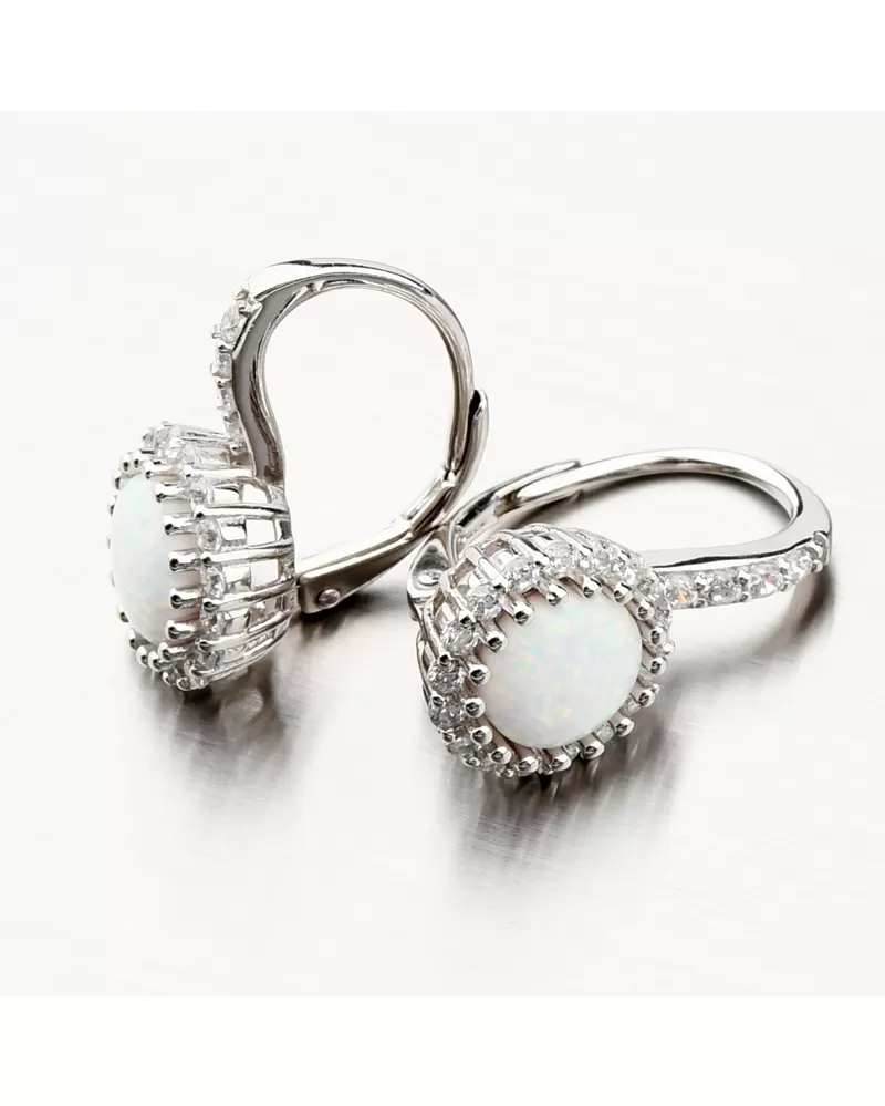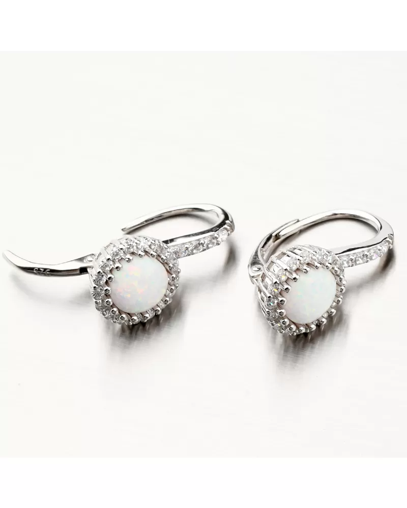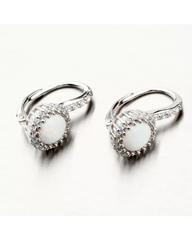Výrazné strieborné náušnice osadené syntetickým opálom v bielej farbe, ktorý má nádherné dúhové odlesky. Náušnice sú navyše ozdobené trblietavými zirkónmi po celom obvode a potom aj na prednej strane zapínania. Zirkóny sú brúsené do briliantového brusu, ktorý prepožičiava kameňom brilanciu pravých diamantov. Dizajn náušníc je elegantný a zažiarite s nimi pri všetkých príležitostiach. Biela farba opálu je symbolom večnej lásky, preto týmito náušnicami urobíte radosť svojej milovanej polovičke. Alebo je druhý variant, že tento opál môže byť použitý na privedenie novej lásky.