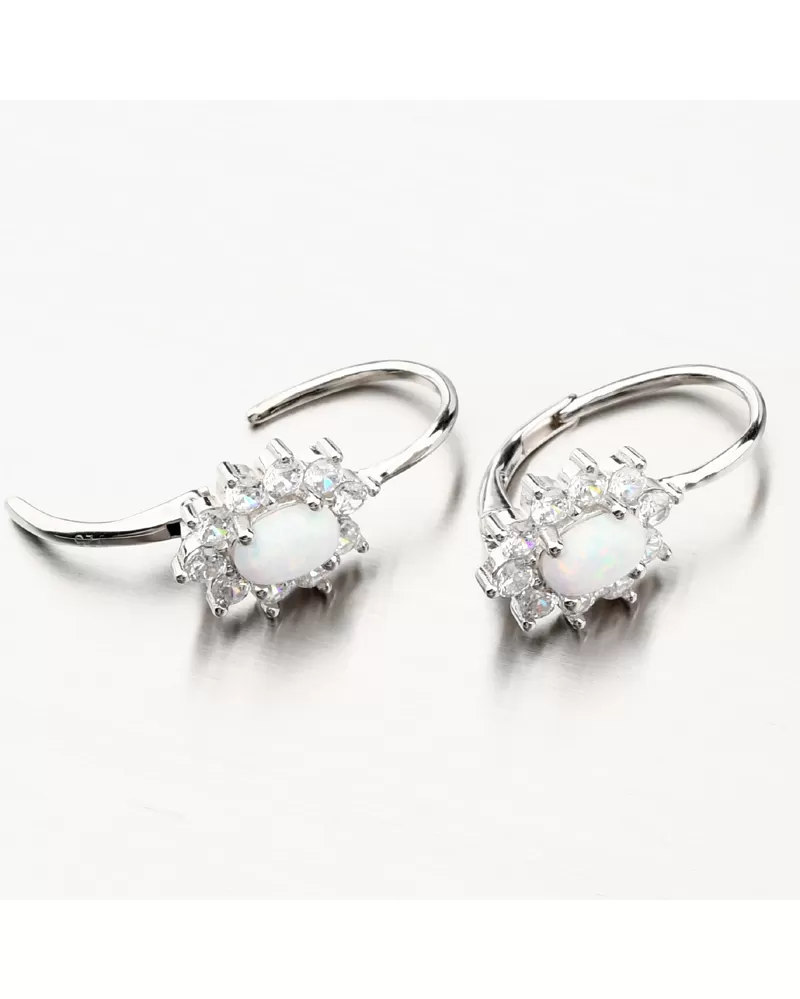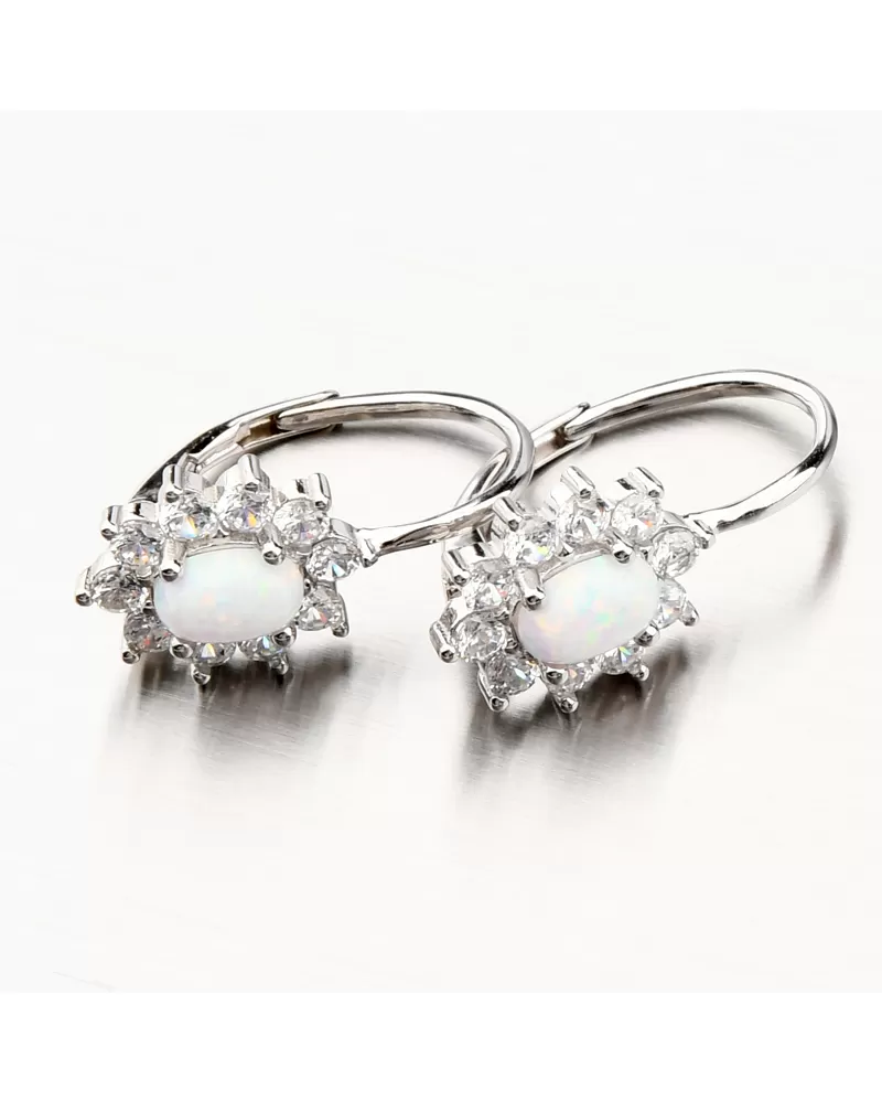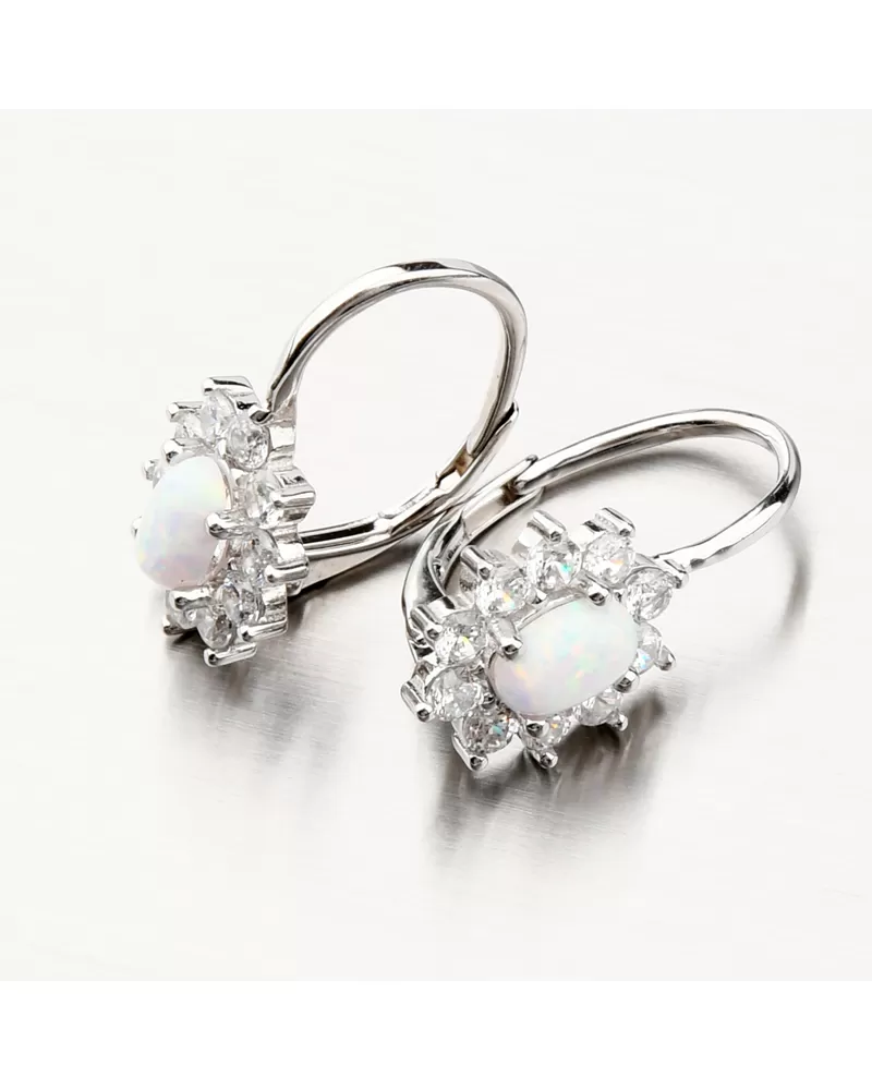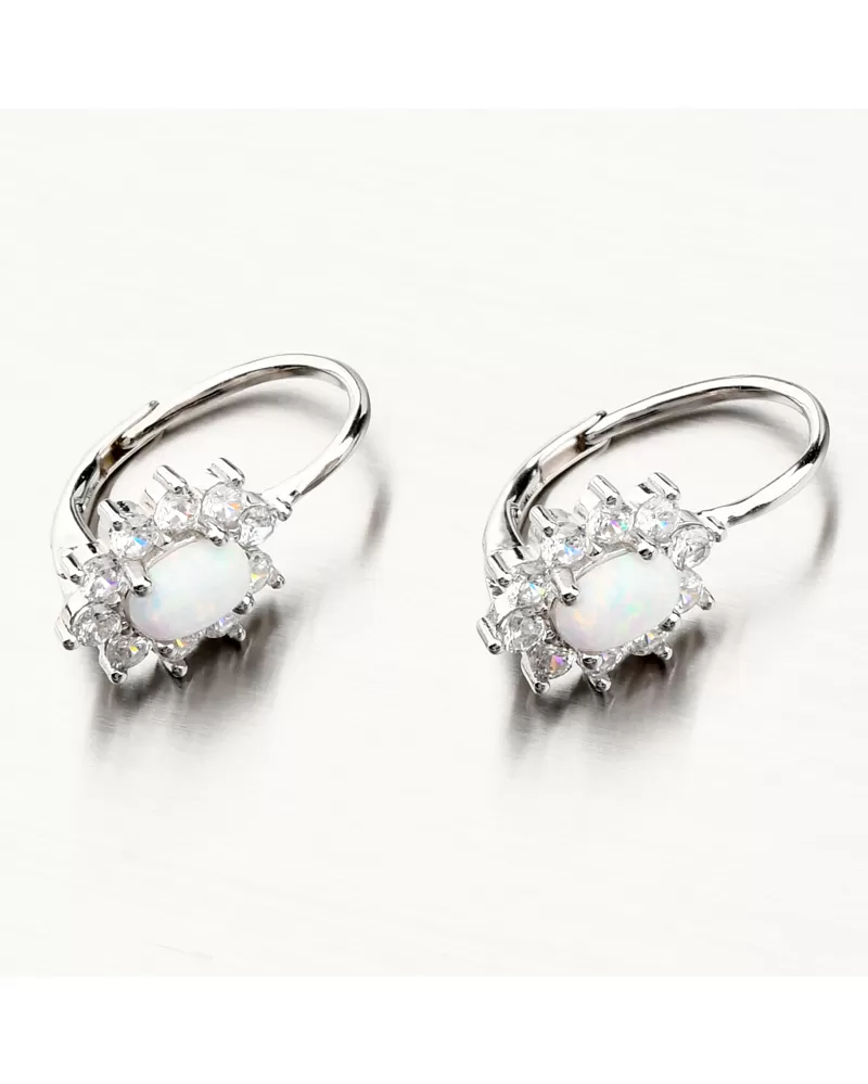 Výrazné strieborné náušnice osadené syntetickým opálom v bielej farbe a ktorý je oválneho tvaru. Opál má nádherné dúhové odlesky. Náušnice sú navyše ozdobené trblietavými zirkónmi po celom obvode. Zirkóny sú brúsené do briliantového brusu, ktorý prepožičiava kameňom brilanciu pravých diamantov. Dizajn náušníc je elegantný a zažiarite s nimi pri všetkých príležitostiach. Biela farba opálu je symbolom večnej lásky, preto týmito náušnicami urobíte radosť svojej milovanej polovičke. Alebo je druhý variant, že tento opál môže byť použitý na privedenie novej lásky.