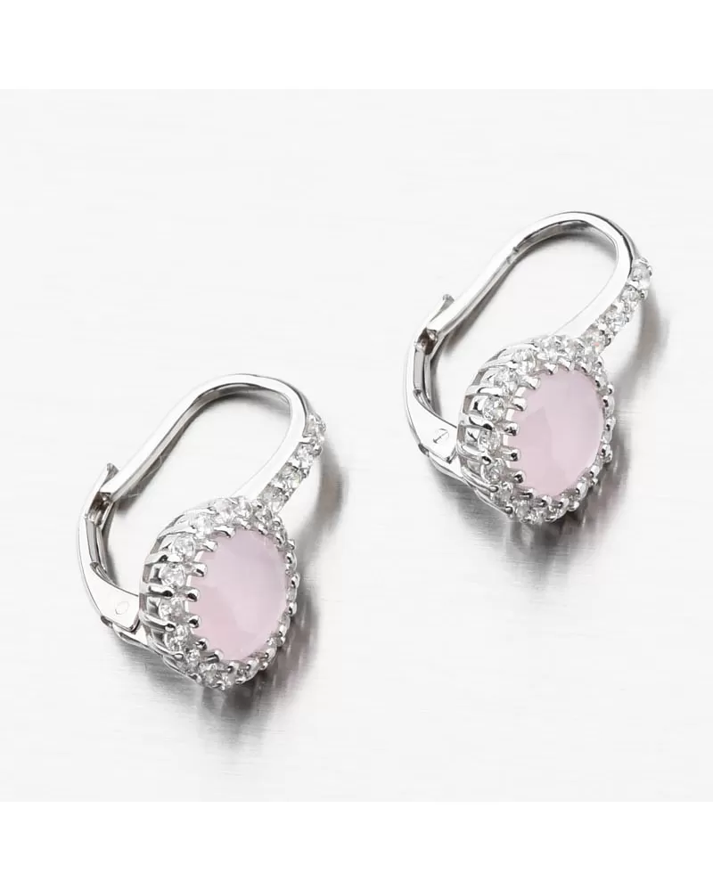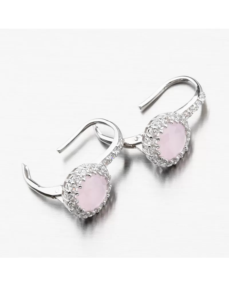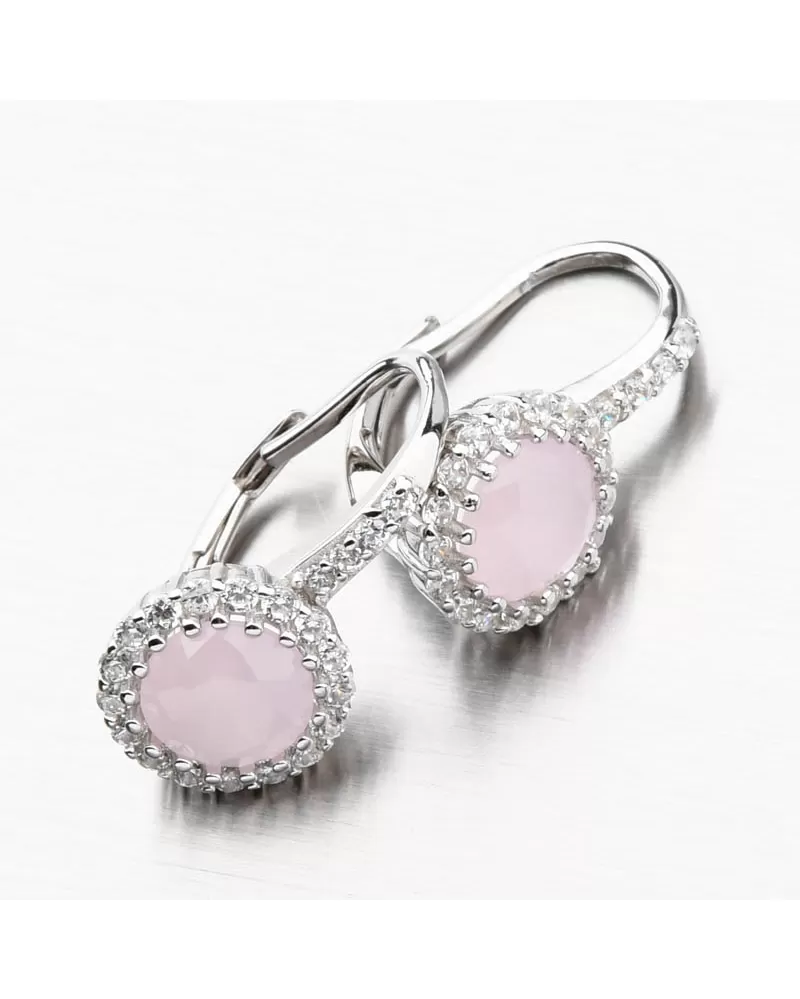 Elegantné strieborné náušnice so syntetickým ružovým zlatom, ktoré je pevne zasadené do kvapiek a obkolesené bielymi zirkónmi. Tie sa vkladajú aj do prednej časti zapínania. Zirkóny sú briliantového brusu, ktorý vytvára oslnivý lesk.