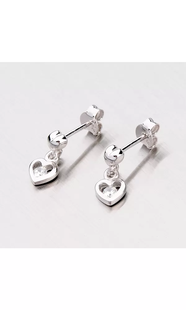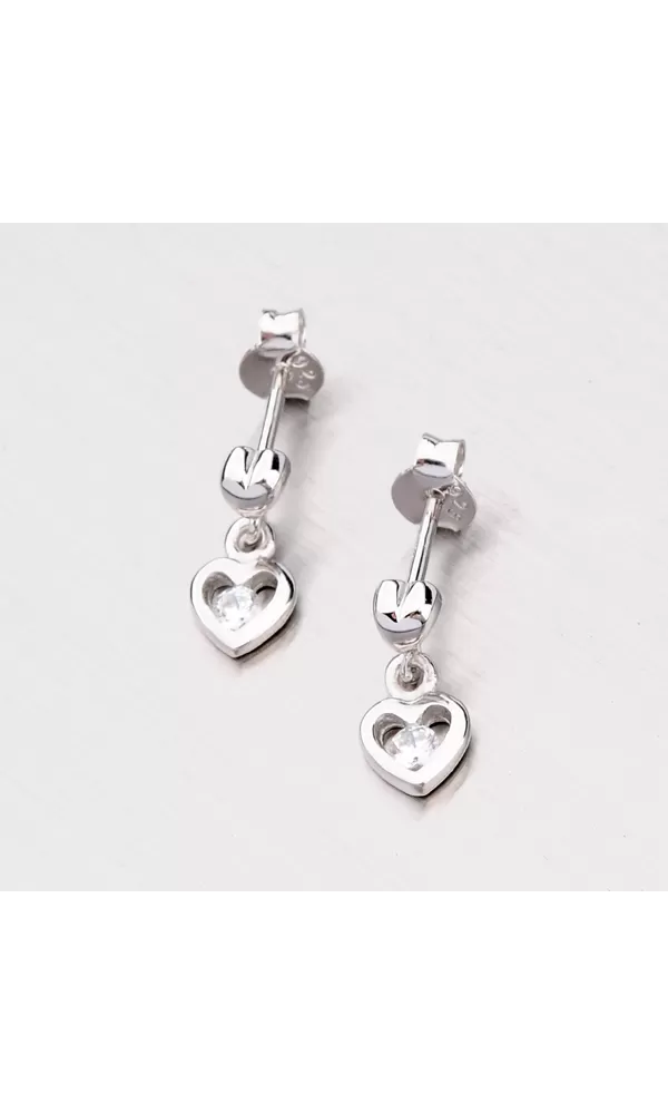Elegantné strieborné náušnice so srdiečkami so zapínaním na puzetku. Náušnice sú osadené žiarivými zirkónmi. Srdiečko a jeden zirkón sú pohyblivé a dodávajú náušniciam ten správny šmrc.