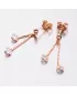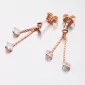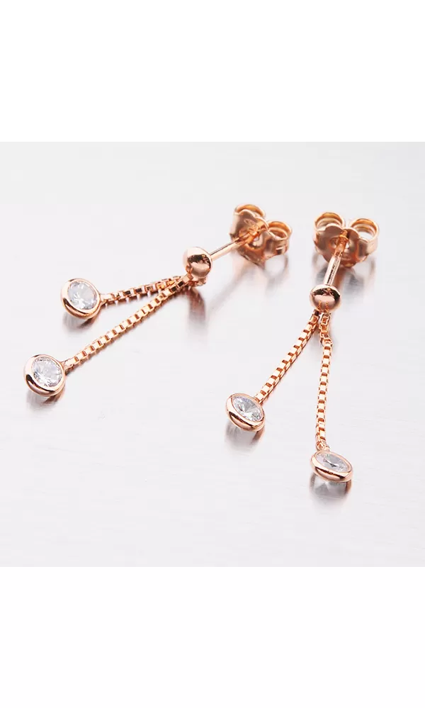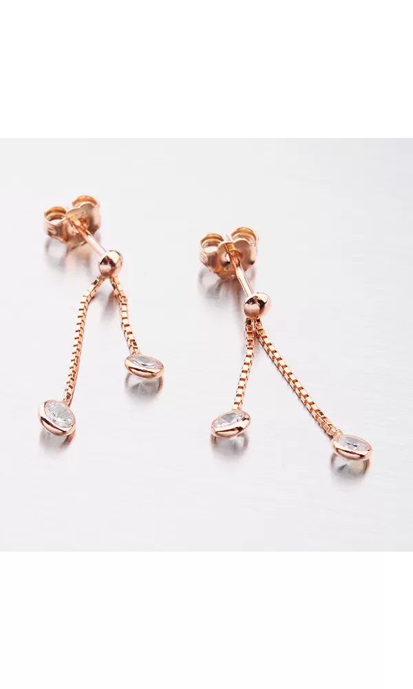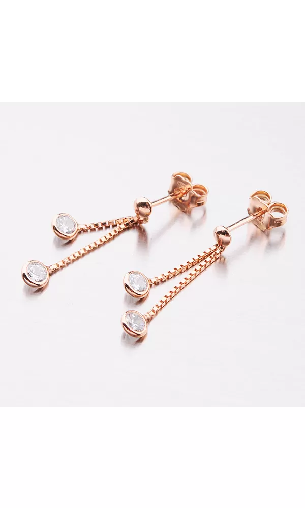 Visiace dámske náušnice sú tvorené dvoma retiazkami na ktoré sú na koncoch vsadené zirkóny v briliantovom bruse.