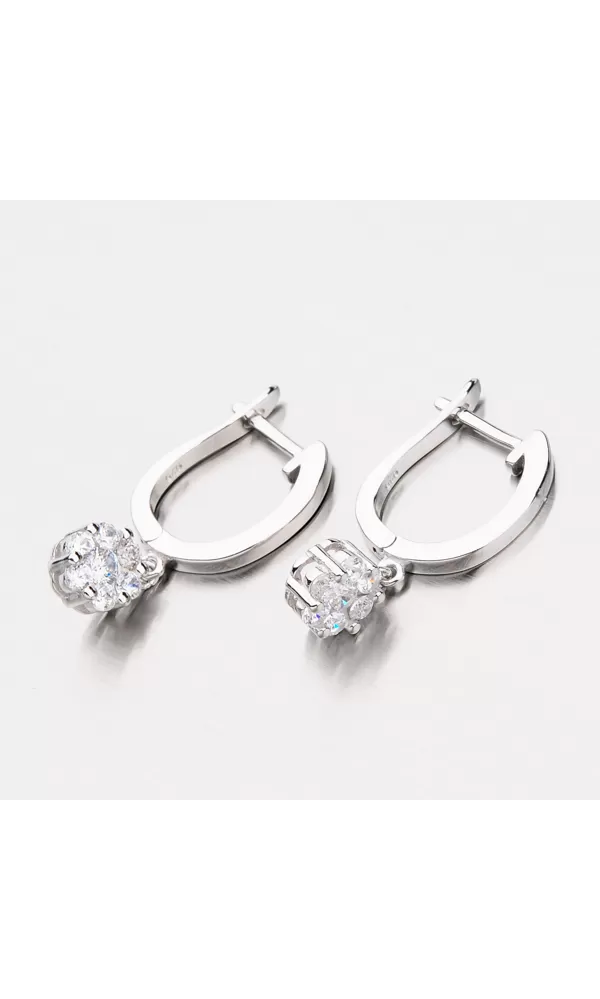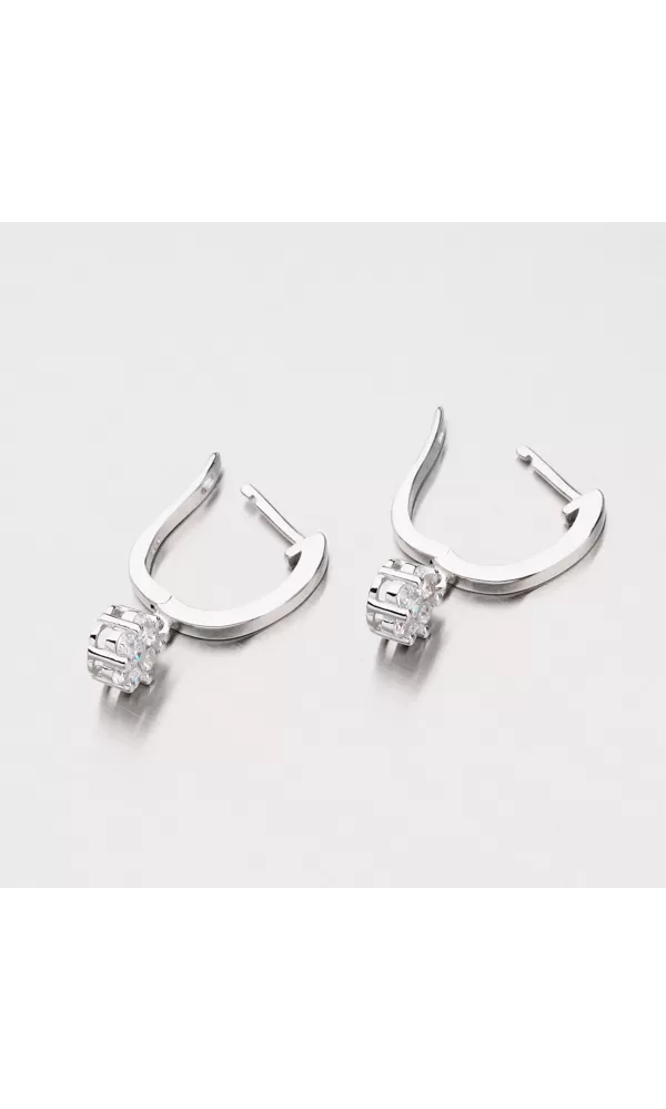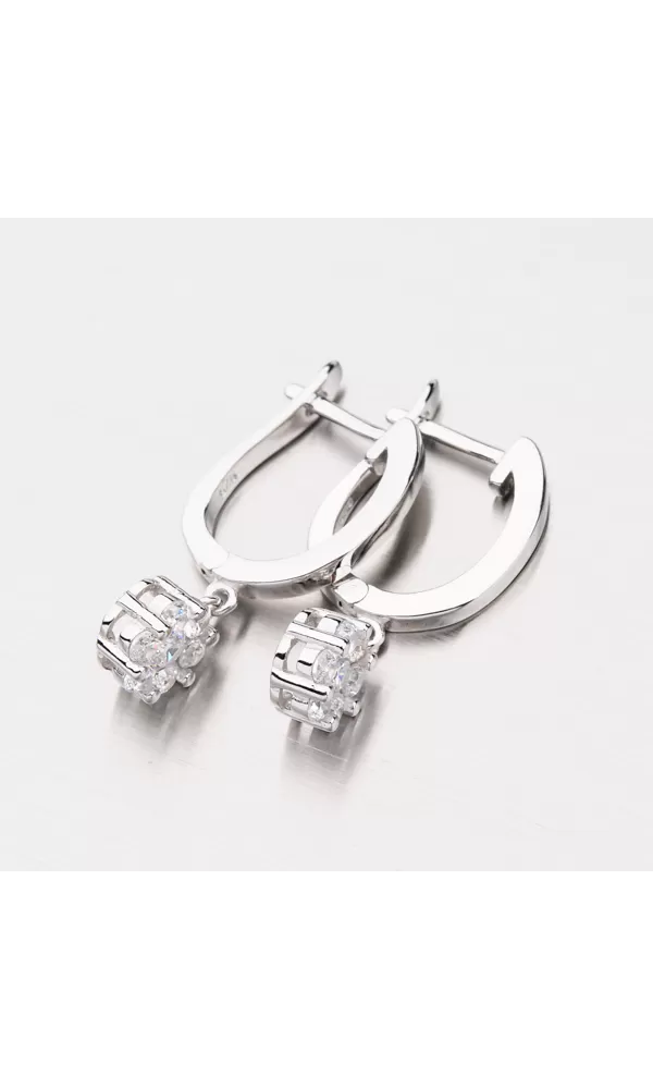 Roztomilé náušnice vyrobené zo striebra s rýdzosťou 925/1000 v lesklej povrchovej úprave so zušľachtením rhodiovaním. Náušnice sa zapínajú na bezpečné klapky vďaka ktorým nehrozí vypadnutie a následná strata náušníc. Visiaci prívesok na náušniciach je zložený zo žiarivých zirkónov bielej farby, ktoré nádherne odrážajú svetlo a dodávajú celému šperku maximálny lesk a brilanciu. Náušnice sú veľmi elegantným kúskom, ktorý si zamilujete. S náušnicami sa nemusíte báť navštíviť žiadny večierok ani ho nosiť v bežný deň.
