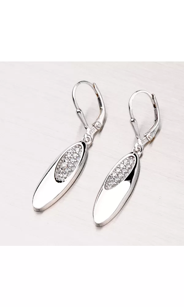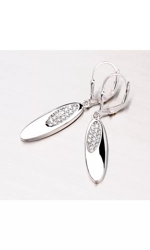 Elegantné dámske náušnice sú vyrobené zo striebra rýdzosti 925/1000 a povrch náušnice je zušľachtený rhodiovaním. Náušnice sú zdobené zirkónmi, ktoré sú vsadené do ozdoby. Náušnice sa zapínajú na klapku a sú v lesklej povrchovej úprave.