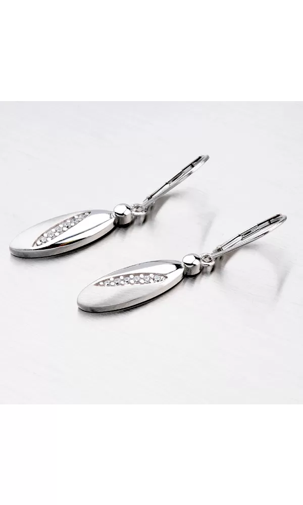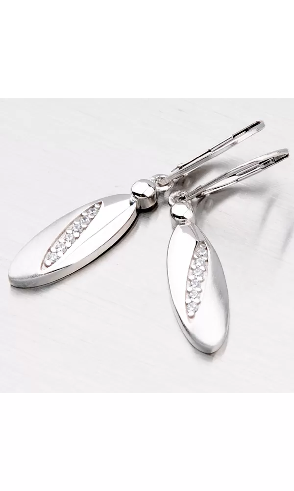Hledáte náušnice, které vás ozdobí na společenskou akci ale taky takové, které můžete nosit každý den? Pro takové případy jsme vyrobili spoustu modelů a jeden z nich jsou tyto náušnice ze stříbra. Náušnice jsou tvořeny přívěskem v kombinaci lesklé a matné povrchové úpravě a zdobené jsou zirkony. Zapínání těchto náušnic je na klapku.