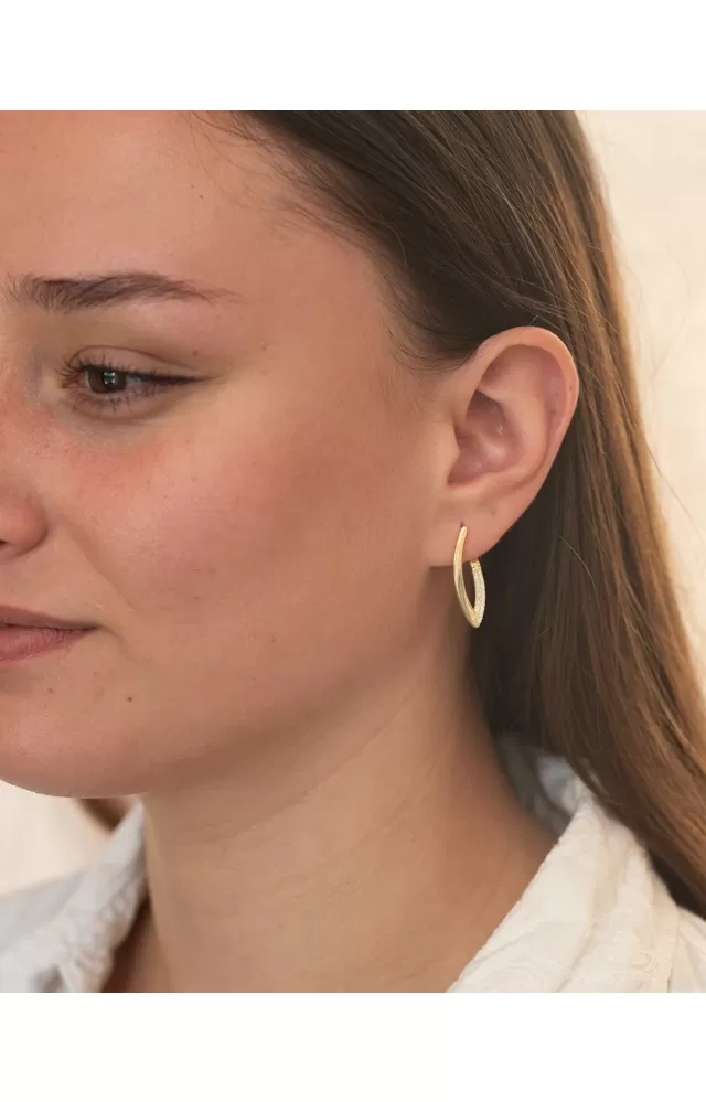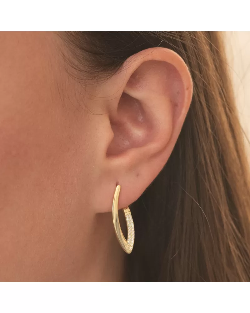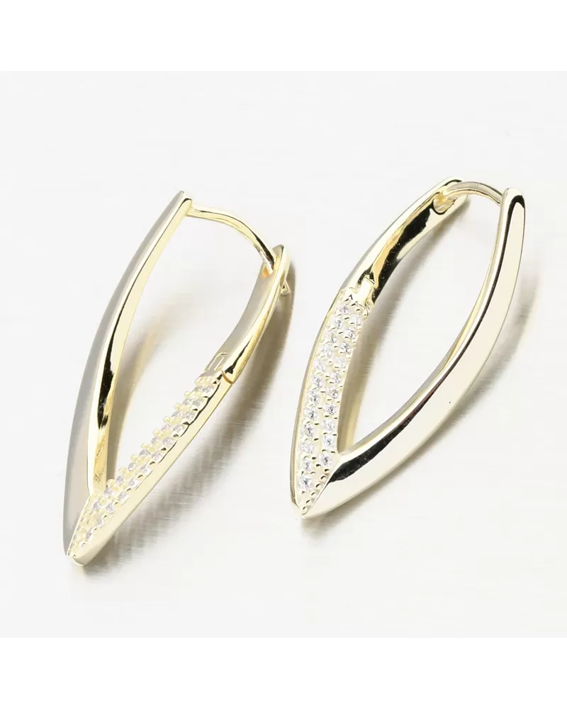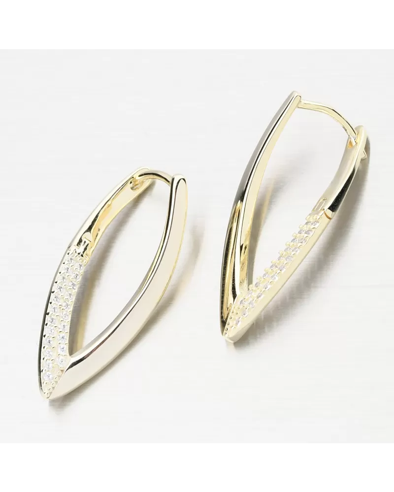 Zlákané strieborné náušnice v tvare písmena v zdobených dvoma radmi brilantných zirkónov. Zirkóny sú brilantným strihom, ktorý poskytuje maximálnu brilanciu leštenej stránky, dokonale odráža svetlo a neuveriteľne svieti zo všetkých pohľadov. Náušnice majú krásny žiarivý vzhľad a pridávajú eleganciu vo všetkých smeroch.