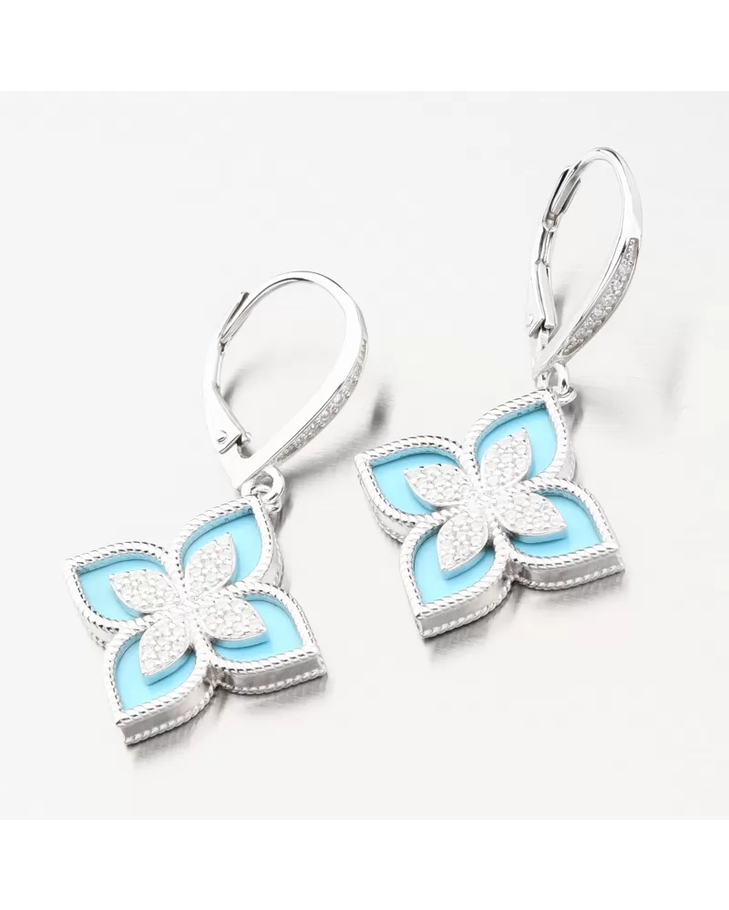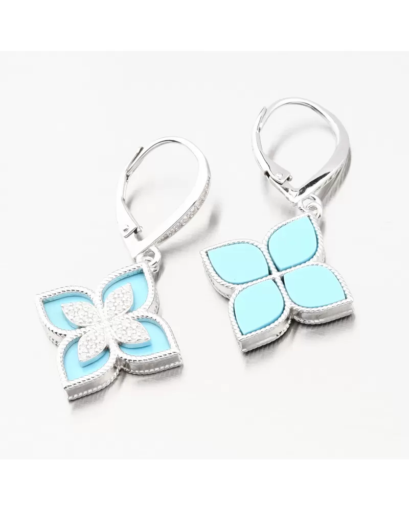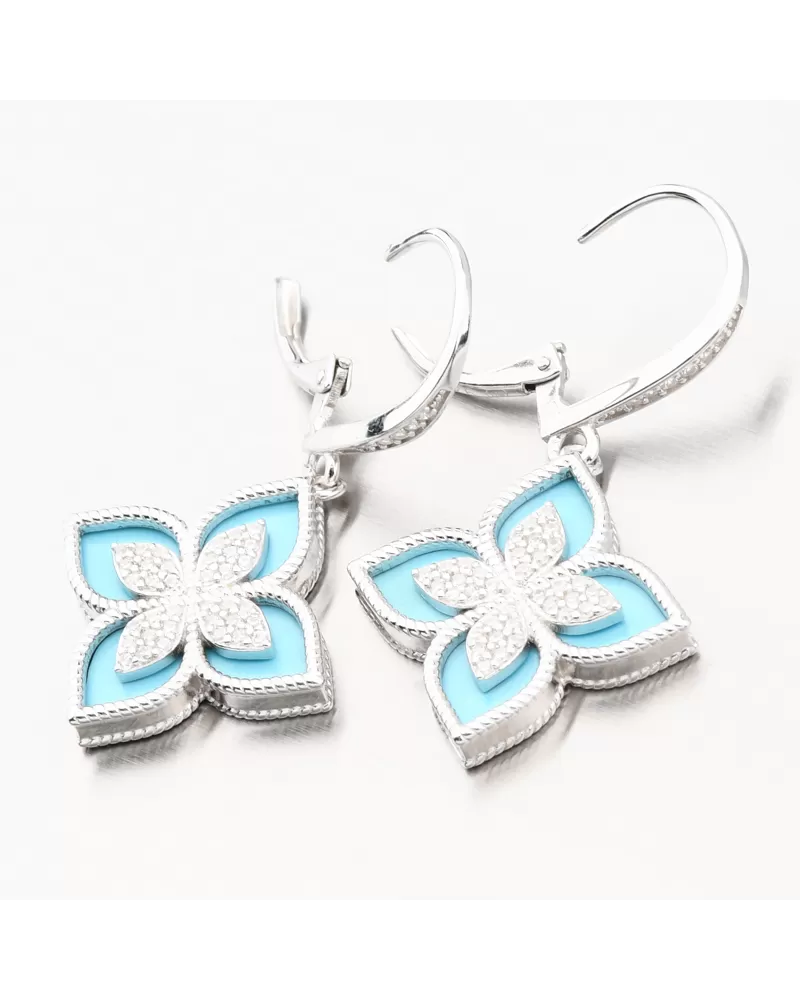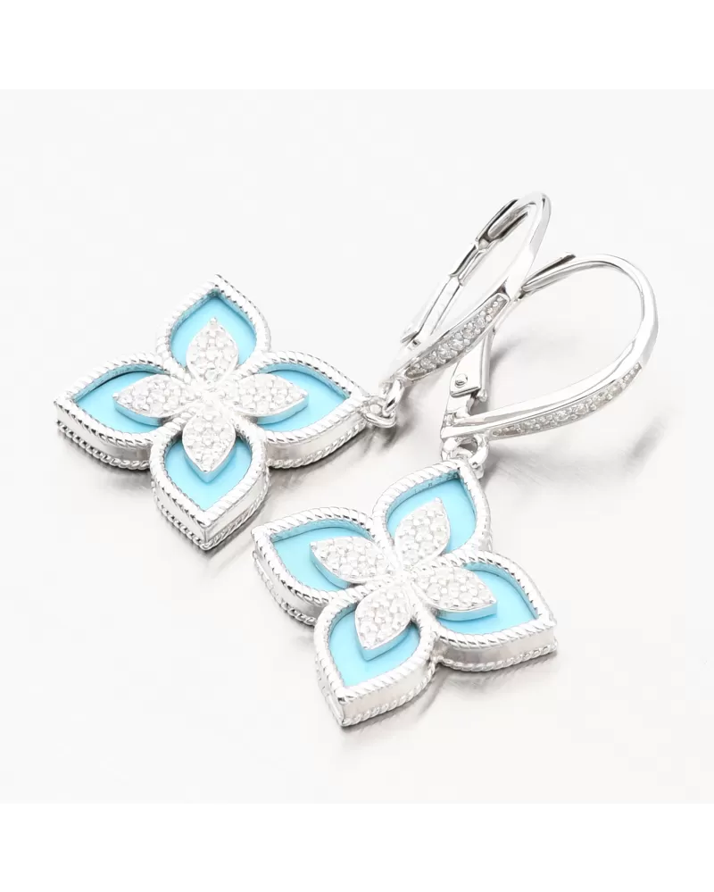 Náušnice stvorené pre spoločenské udalosti alebo iné významné udalosti pri ktorých si prajete byť krásna. Hlavným prvkom náušníc sú visiace kvety ozdobené žiarivými zirkónmi v samotnom strede a potom so syntetickým Angelitom. Angelit má svetlo modrú farbu, čo dodáva náušniciam sofistikovaný a štýlový vzhľad. Tieto náušnice nie sú iba krásnym šperkom, ale aj symbolom luxusu a krásy. Zirkóny sú vsadené aj na prednej časti zapínania. Všetky zirkóny sú briliantového brúsu, ktorý zaisťuje maximálnu brilanciu vybrúsených facet, dokonale odráža svetlo a neuveriteľne žiari z každého uhla pohľadu.
