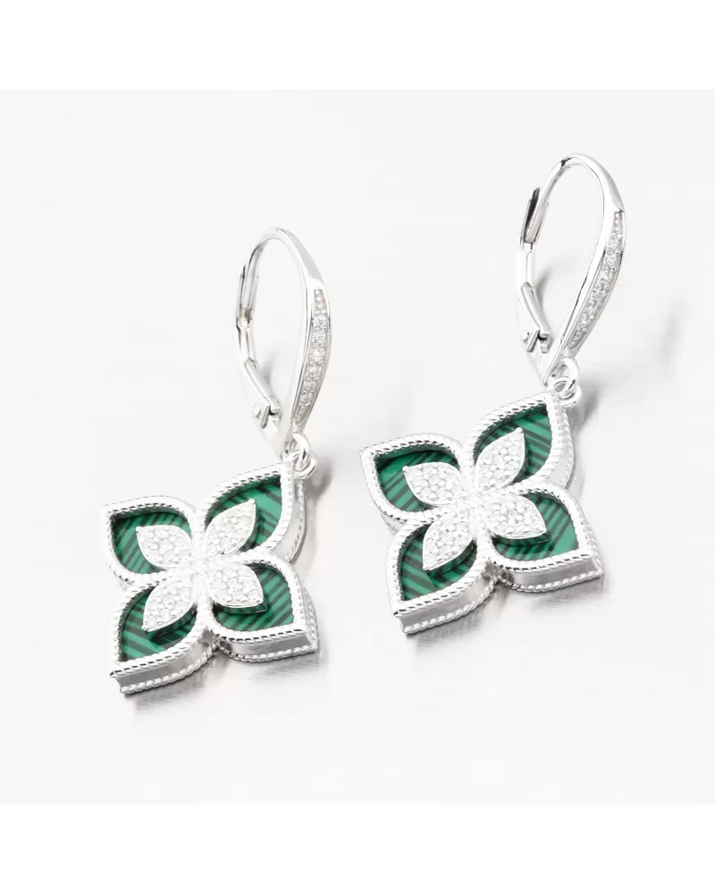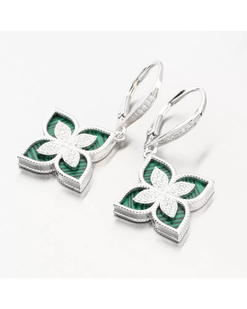 Náušnice stvorené pre spoločenské udalosti alebo iné významné udalosti pri ktorých si prajete byť krásna. Hlavným prvkom náušníc sú visiace kvety ozdobené žiarivými zirkónmi v samotnom strede a potom so syntetickým malachitom. Malachit má zelenú farbu, čo dodáva náušniciam sofistikovaný a štýlový vzhľad. Tieto náušnice nie sú iba krásnym šperkom, ale aj symbolom luxusu a krásy. Zirkóny sú vsadené aj na prednej časti zapínania. Všetky zirkóny sú briliantového brúsu, ktorý zaisťuje maximálnu brilanciu vybrúsených facet, dokonale odráža svetlo a neuveriteľne žiari z každého uhla pohľadu.