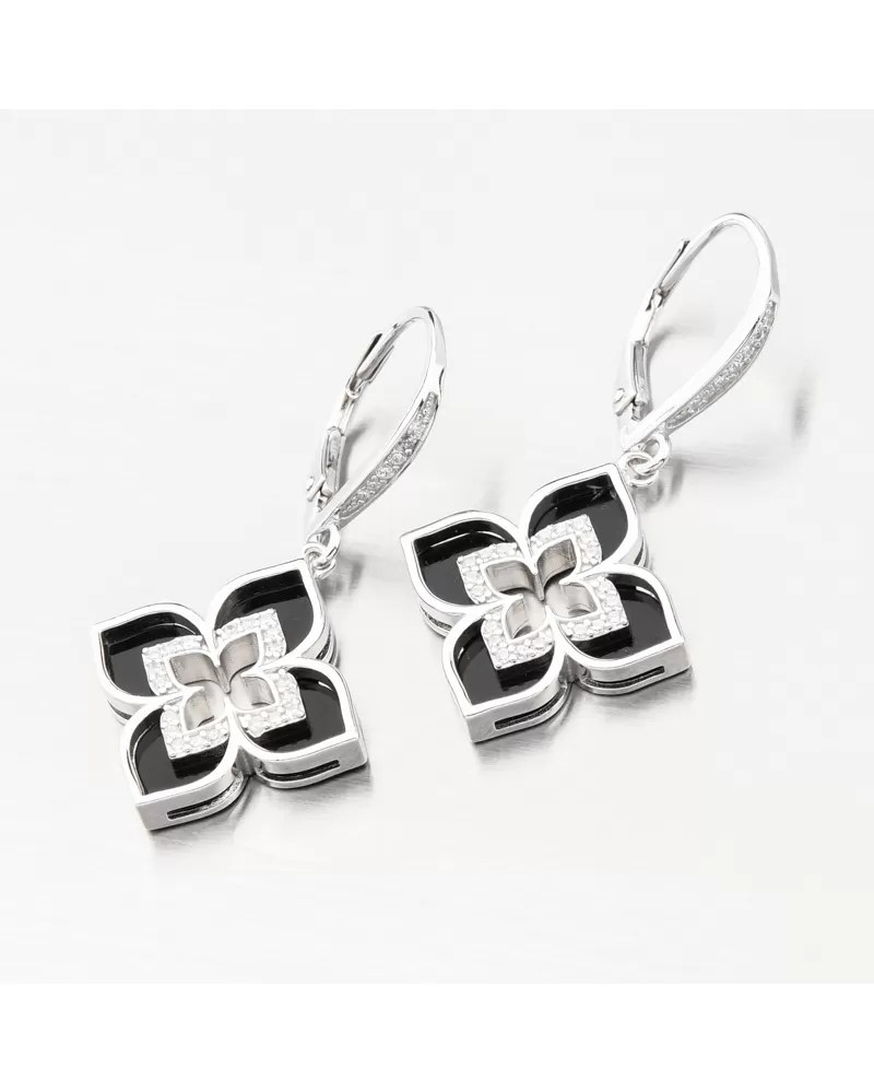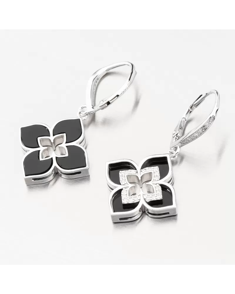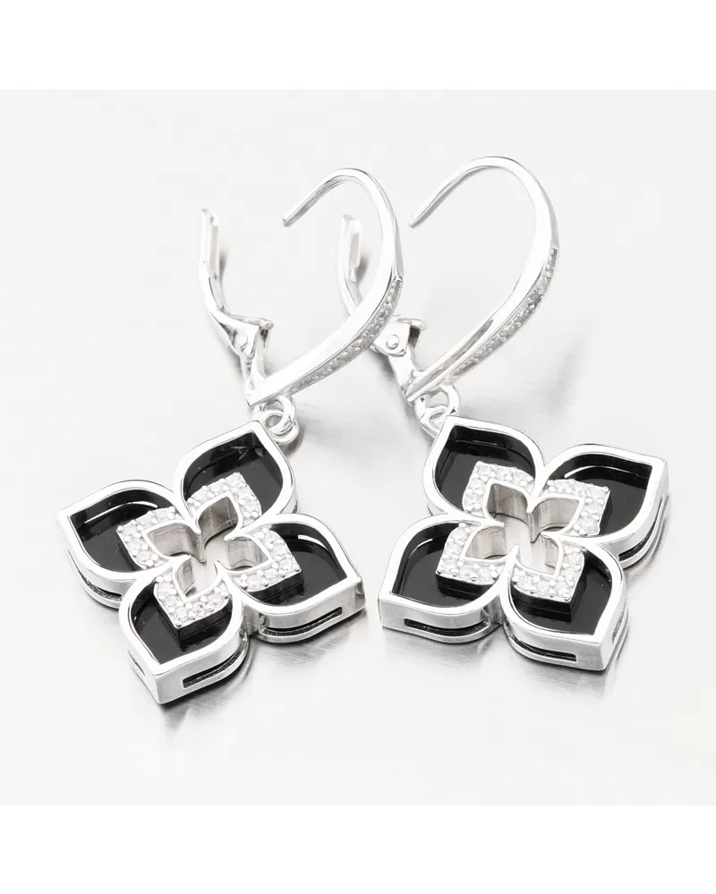 Náušnice stvorené pre spoločenské udalosti alebo iné významné udalosti pri ktorých si prajete byť krásna. Hlavným prvkom náušníc sú visiace kvety ozdobené žiarivými zirkónmi v samotnom strede a potom so syntetickým onyxom. Onyx má čiernu farbu, čo dodáva náušniciam sofistikovaný a štýlový vzhľad. Tieto náušnice nie sú iba krásnym šperkom, ale aj symbolom luxusu a krásy. Zirkóny sú vsadené aj na prednej časti zapínania. Všetky zirkóny sú briliantového brúsu, ktorý zaisťuje maximálnu brilanciu vybrúsených facet, dokonale odráža svetlo a neuveriteľne žiari z každého uhla pohľadu.